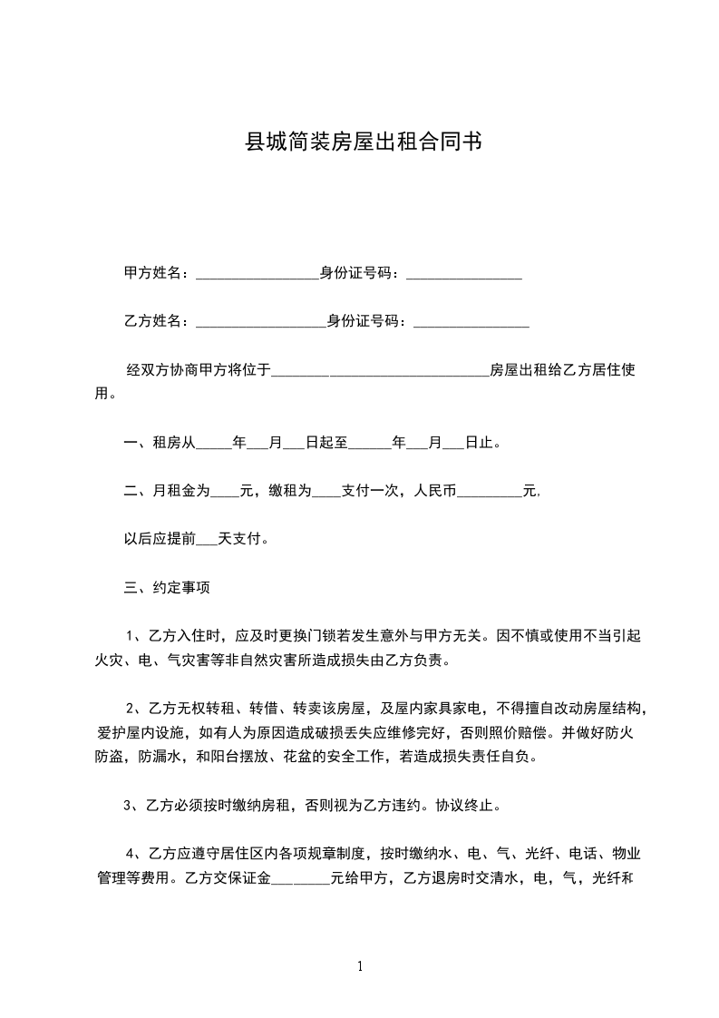 4、乙方应遵守居住区内各项规章制度,按时缴纳水、电、气、光纤、电话、物业管理等费用。乙方交保证金________元给甲方,乙方退房时交清水,电,气,光纤和物业管理等费用及屋内设施家具、家电无损坏,下水管道,厕所无堵漏。甲方如数退还保证金。