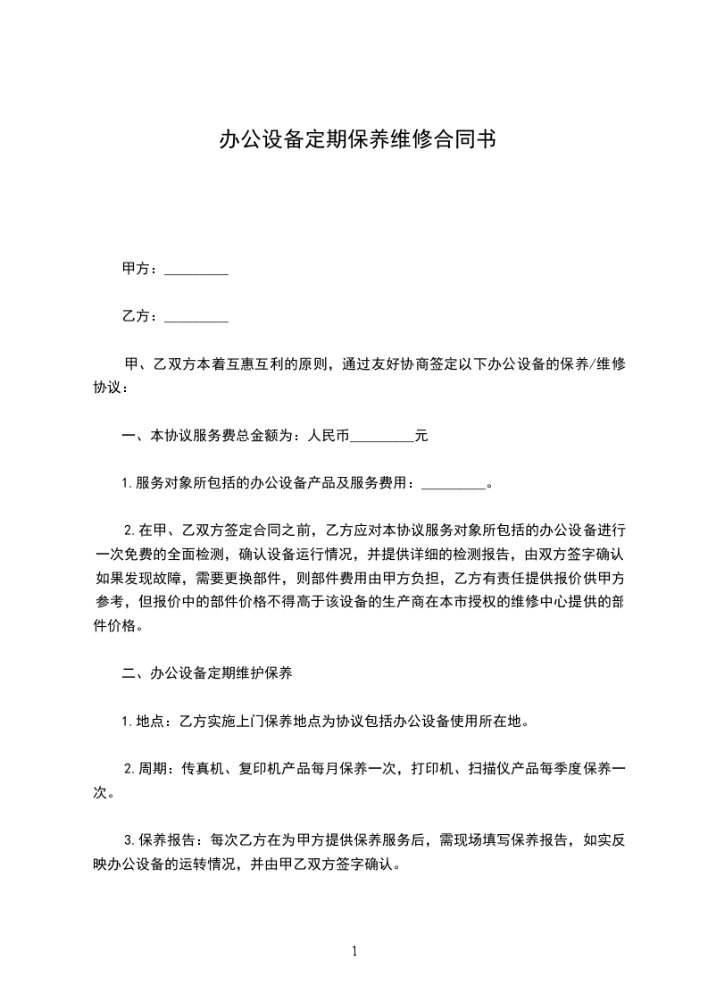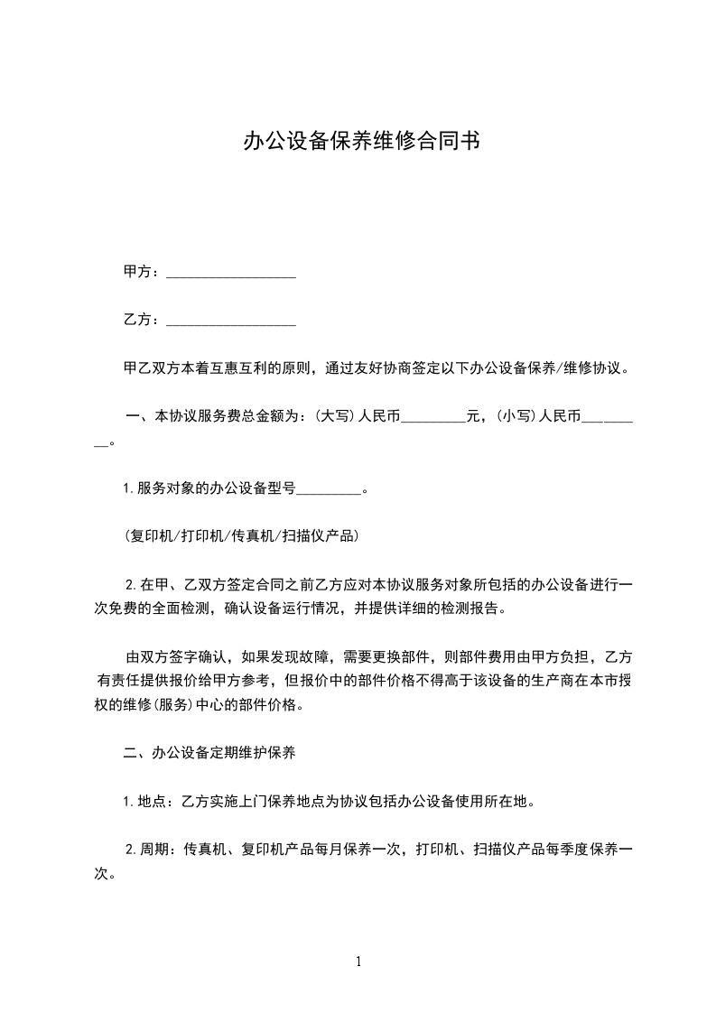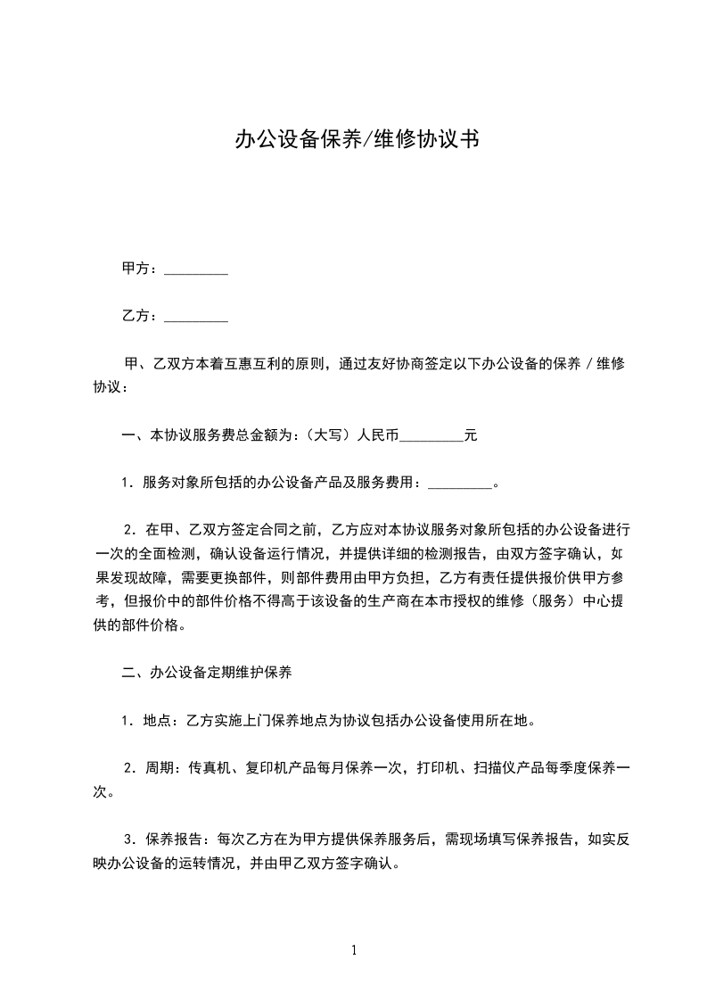 甲、乙双方本着互惠互利的原则,通过友好协商签定以下办公设备的保养/维修协议: