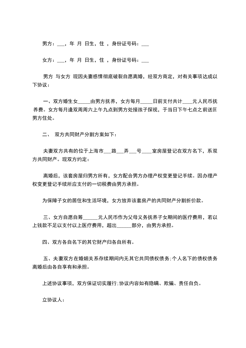 男方与女方现因夫妻感情彻底破裂自愿离婚,经双方商定,对有关事项达成以下协议: