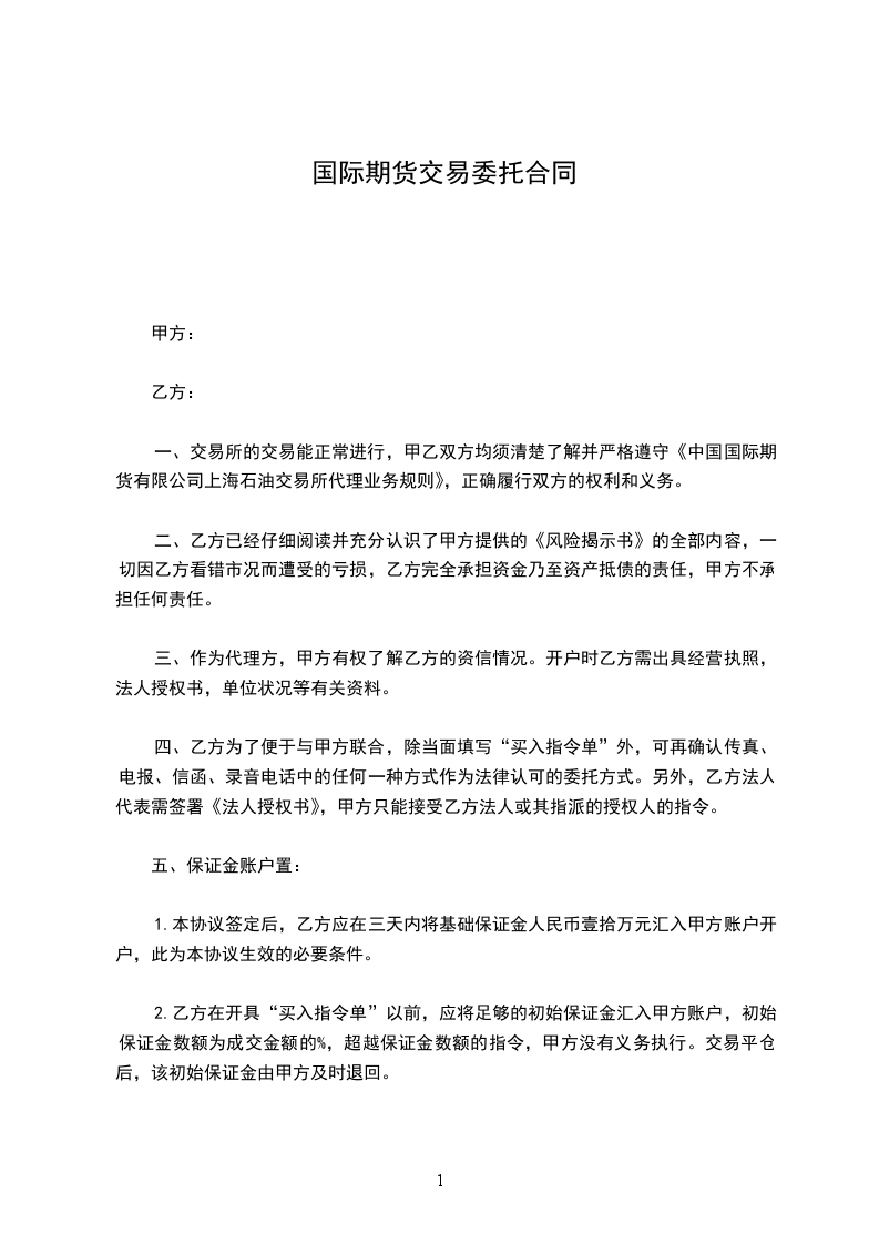 2.乙方在开具“买入指令单”以前,应将足够的初始保证金汇入甲方账户,初始保证金数额为成交金额的_____%,超越保证金数额的指令,甲方没有义务执行。交易平仓后,该初始保证金由甲方及时退回。