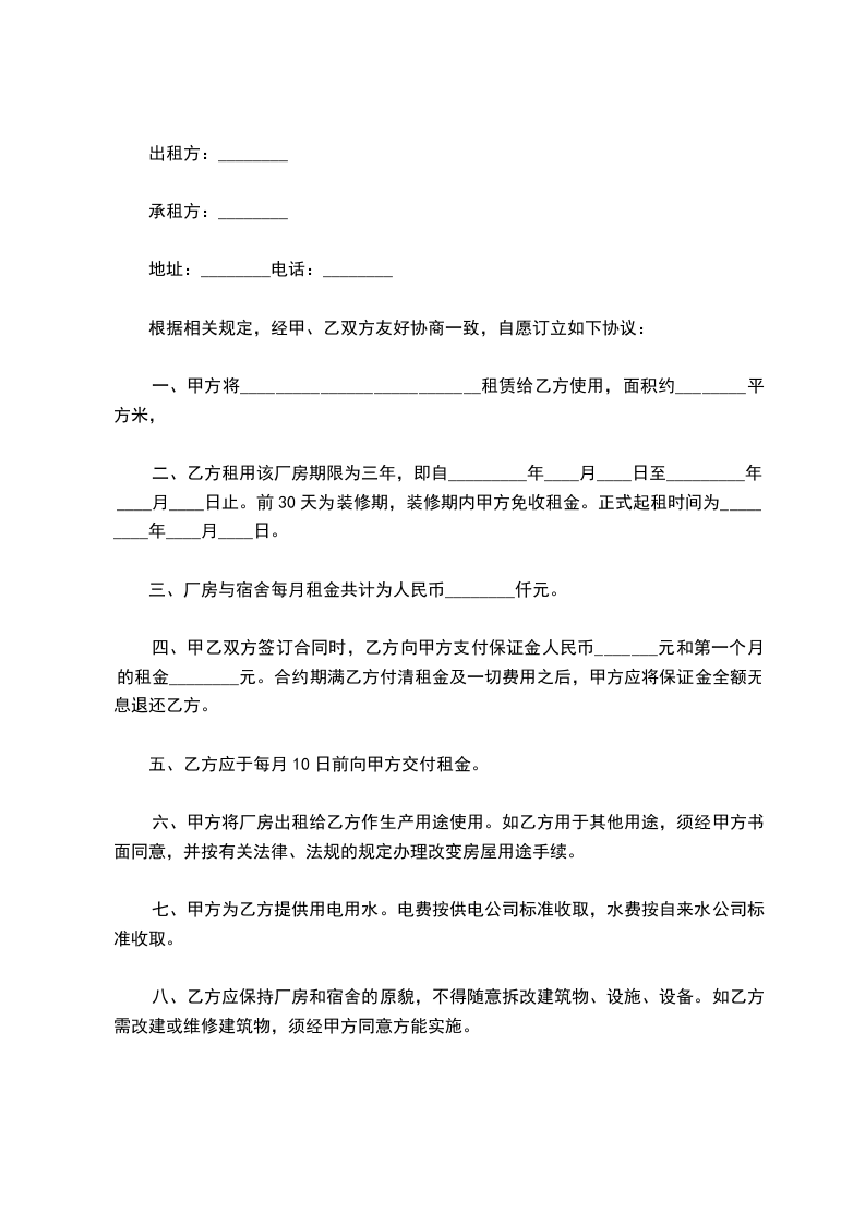 二、乙方租用该厂房期限为三年,即自_________年____月____日至_________年____月____日止。前30天为装修期,装修期内甲方免收租金。正式起租时间为_________年____月____日。