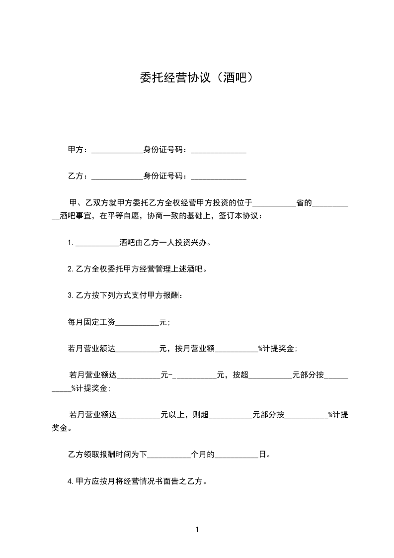 甲、乙双方就甲方委托乙方全权经营甲方投资的位于___________省的___________酒吧事宜,在平等自愿,协商一致的基础上,签订本协议: