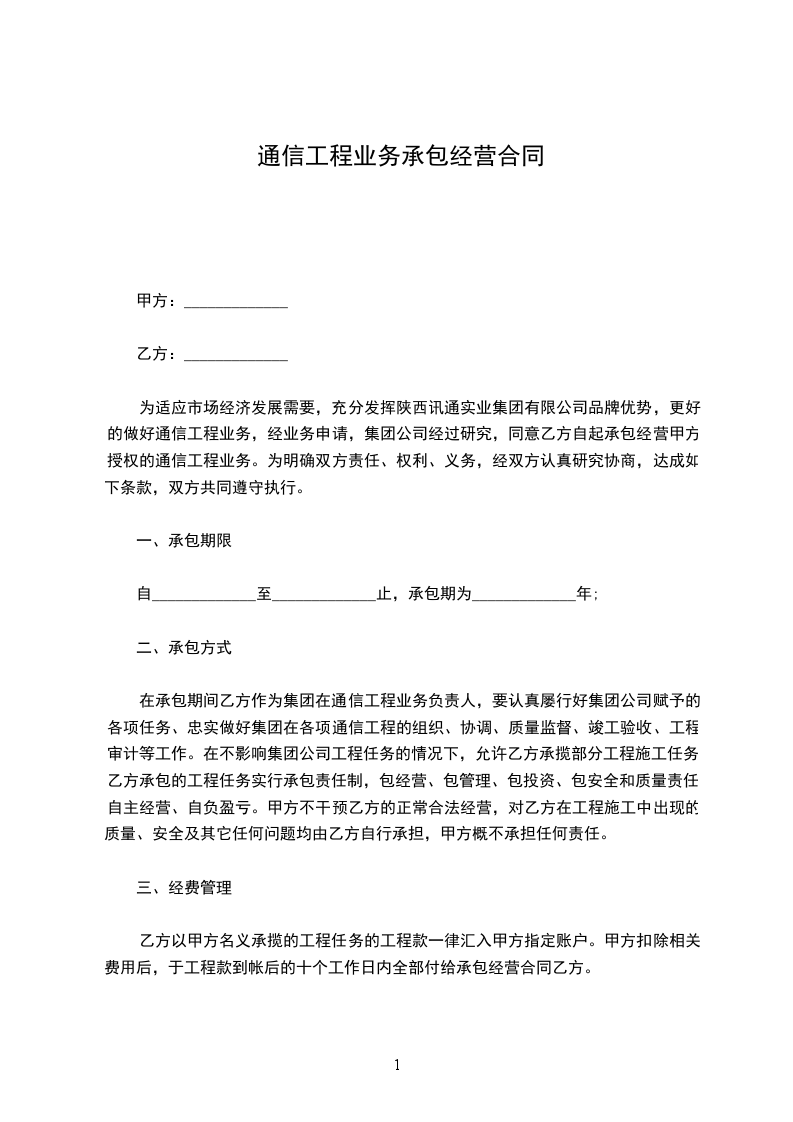 为适应市场经济发展需要,充分发挥陕西讯通实业集团有限公司品牌优势,更好的做好通信工程业务,经业务申请,集团公司经过研究,同意乙方自起承包经营甲方授权的通信工程业务。为明确双方责任、权利、义务,经双方认真研究协商,达成如下条款,双方共同遵守执行。