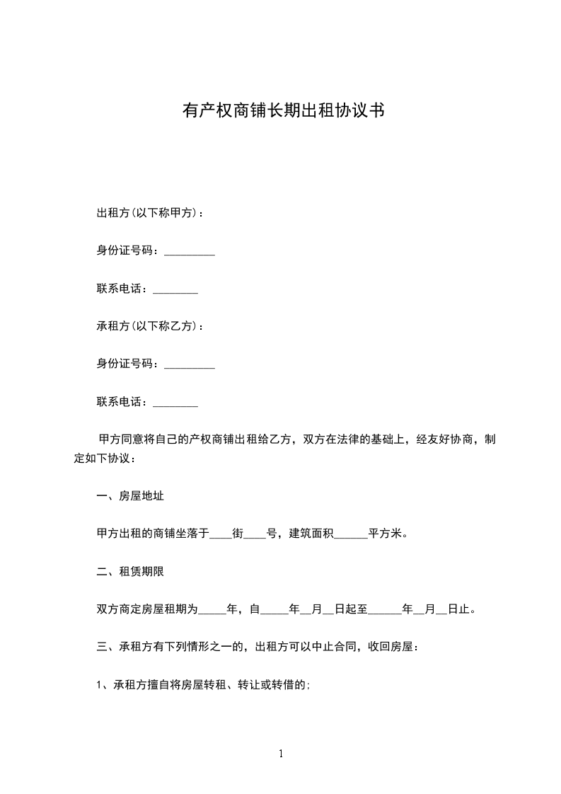 甲方同意将自己的产权商铺出租给乙方,双方在法律的基础上,经友好协商,制定如下协议: