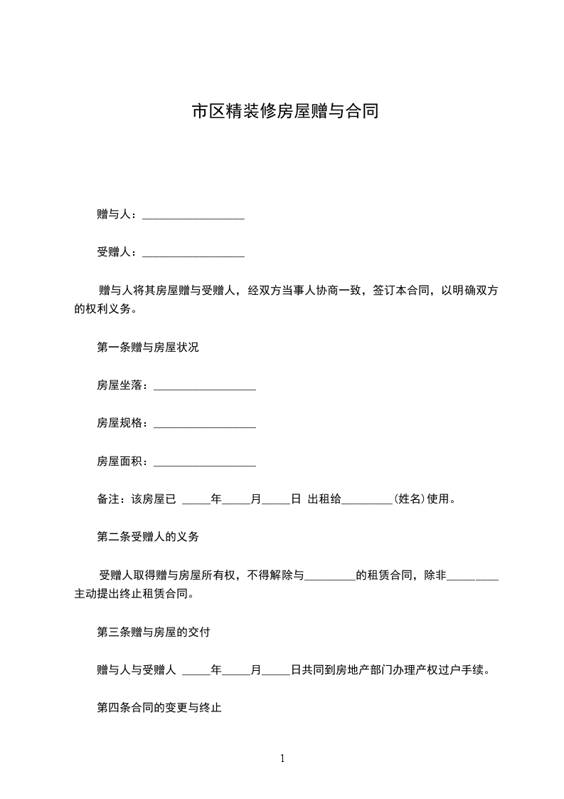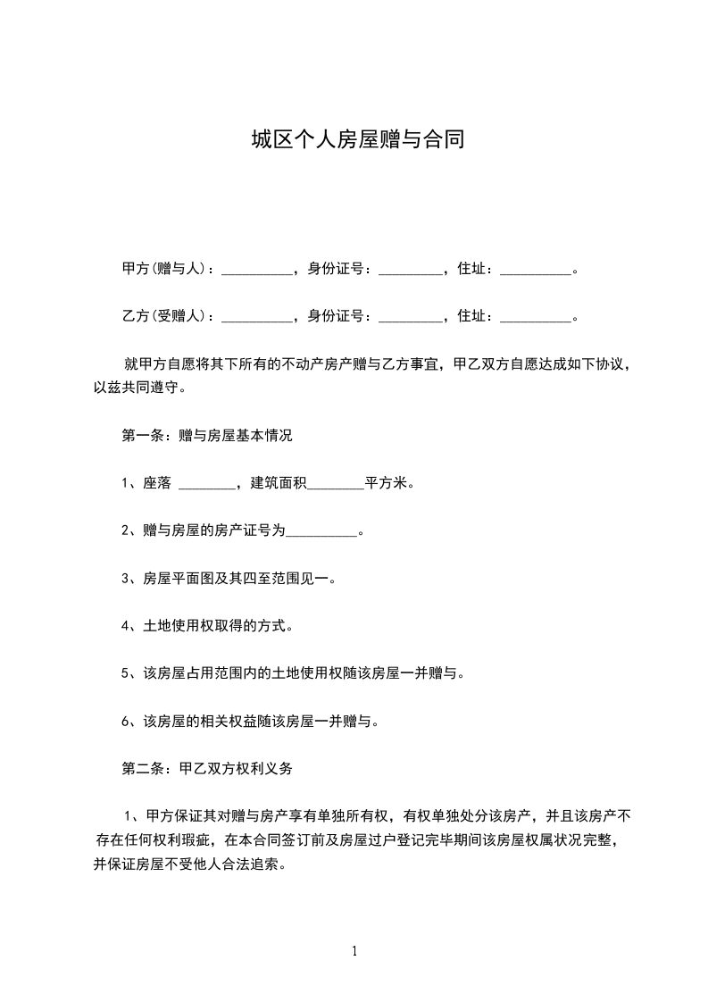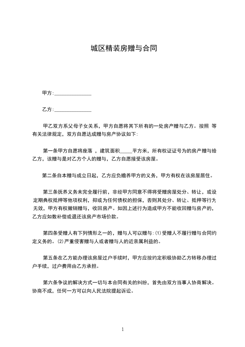 第一条甲方决定将位于_________区_________街_________楼_________层_________号的房屋一套,建筑面积_________平方米无偿赠与给乙方;乙方同意接受此赠与。