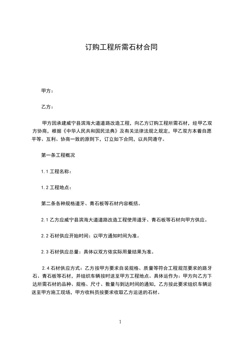甲方因承建威宁县滨海大道道路改造工程,向乙方订购工程所需石材,经甲乙双方协商,根据《中华人民共和国民法典》及有关法律法规之规定,甲乙双方本着自愿、平等、互利、协商一致的原则下,订立如下合同,以共同遵守。