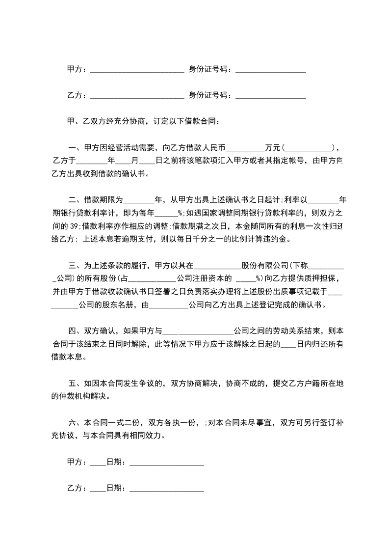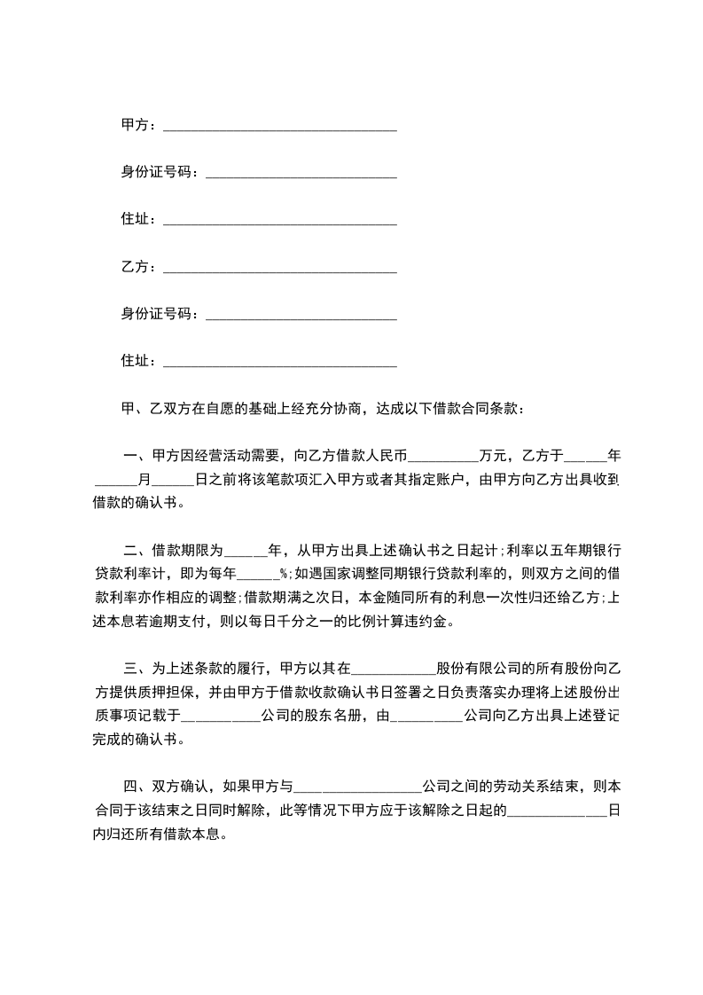 四、双方确认,如果甲方与__________________公司之间的劳动关系结束,则本合同于该结束之日同时解除,此等情况下甲方应于该解除之日起的______________日内归还所有借款本息。