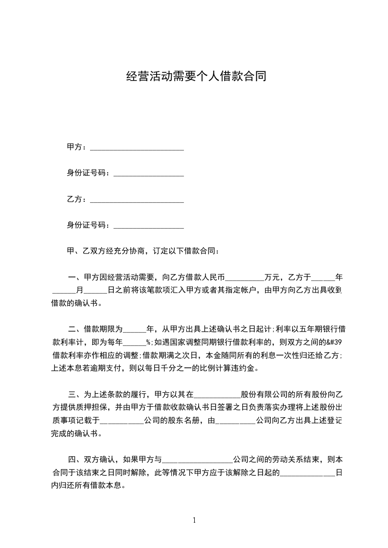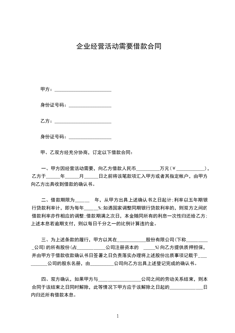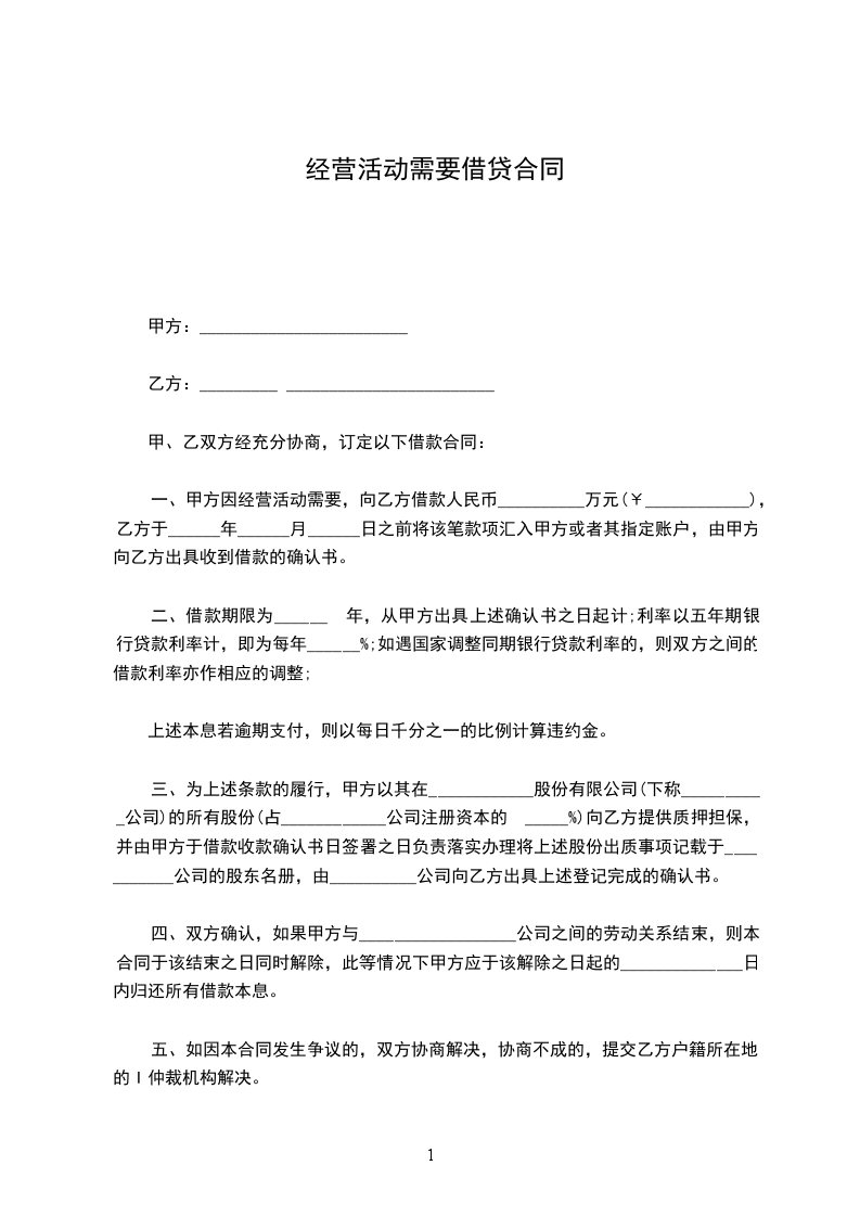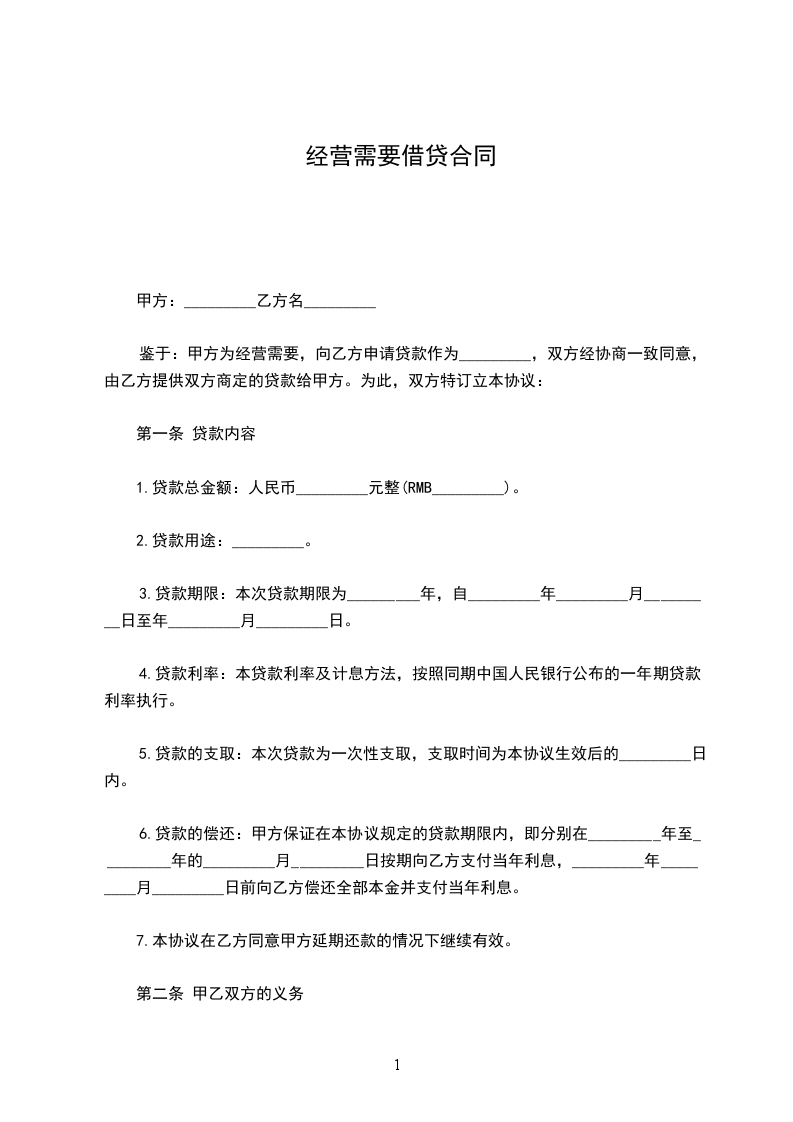 一、甲方因经营活动需要,向乙方借款人民币__________万元,乙方于______年______月______日之前将该笔款项汇入甲方或者其指定账户,由甲方向乙方出具收到借款的确认书。