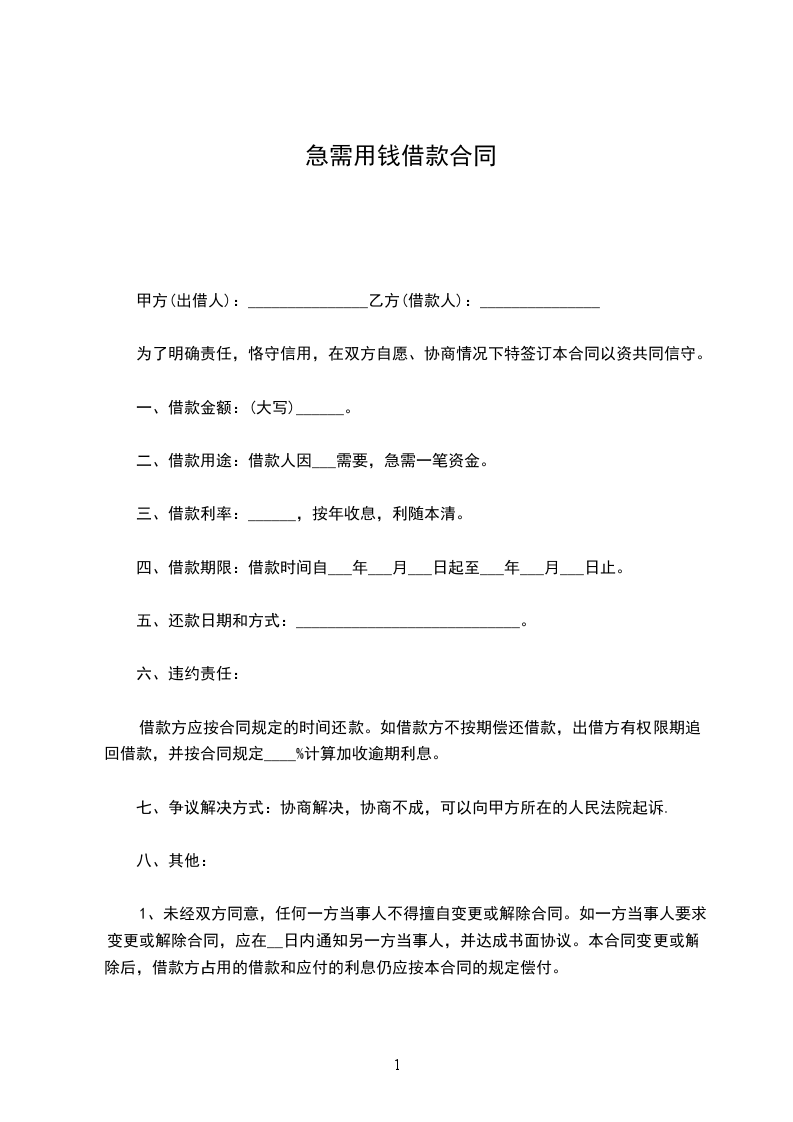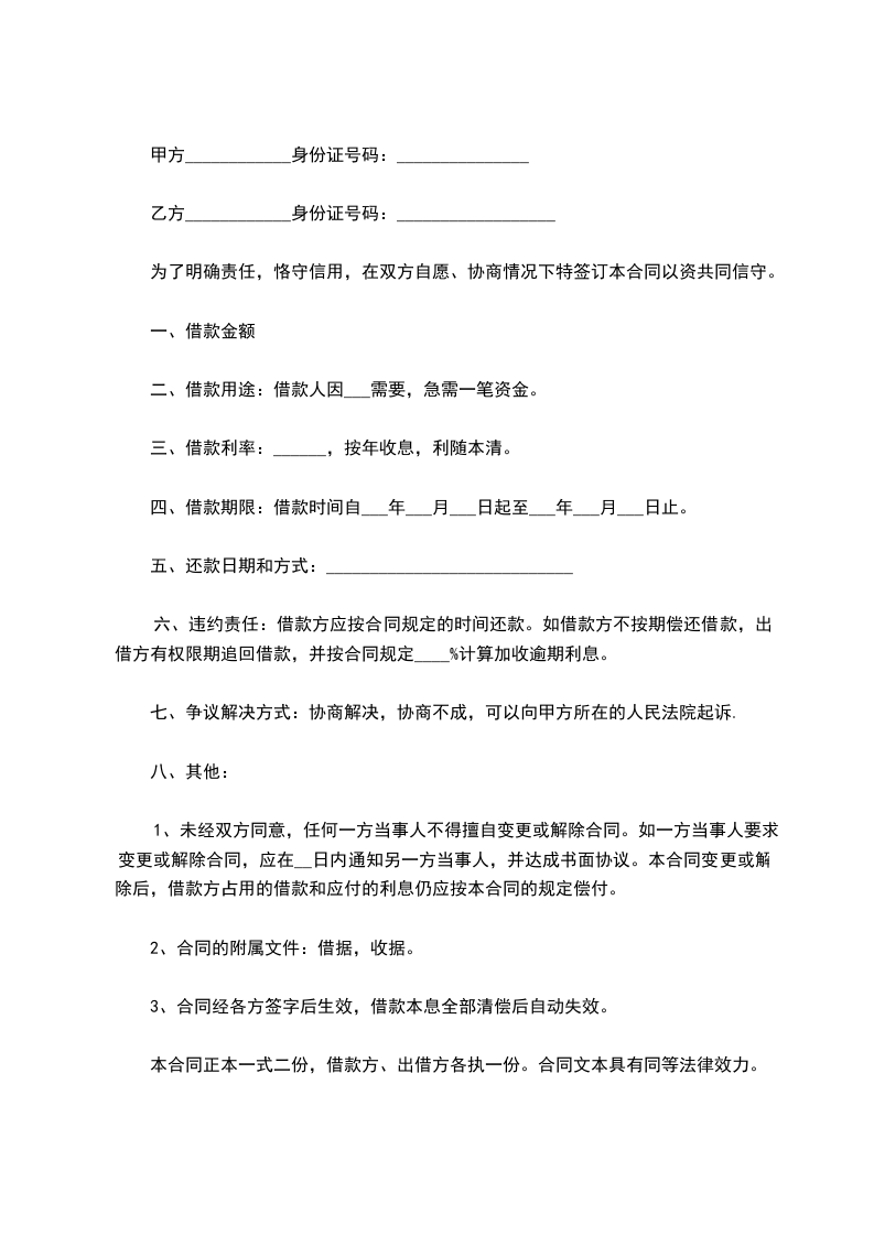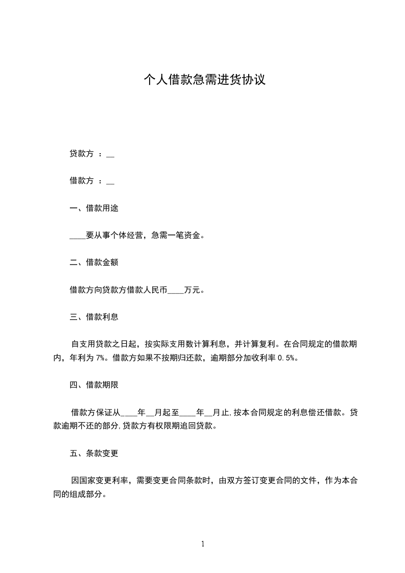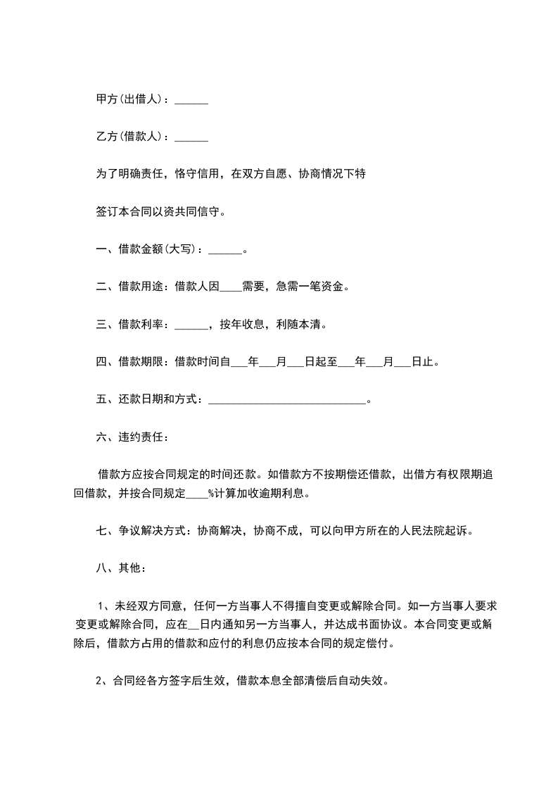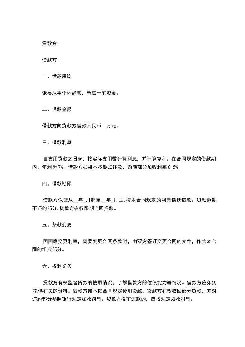 1、未经双方同意,任何一方当事人不得擅自变更或解除合同。如一方当事人要求变更或解除合同,应在__日内通知另一方当事人,并达成书面协议。本合同变更或解除后,借款方占用的借款和应付的利息仍应按本合同的规定偿付。