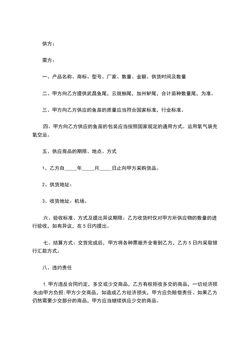 三、甲方向乙方供应的鱼苗的质量应当符合国家标准,行业标准。