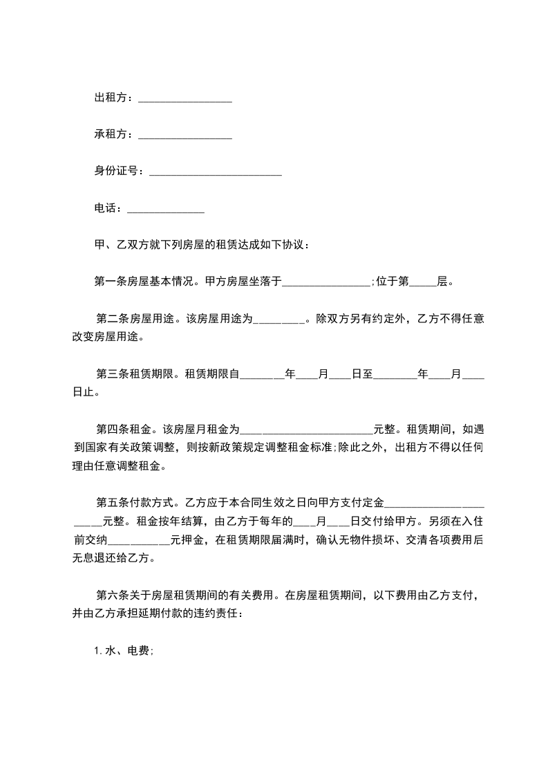 第四条租金。该房屋月租金为________________________元整。租赁期间,如遇到国家有关政策调整,则按新政策规定调整租金标准;除此之外,出租方不得以任何理由任意调整租金。