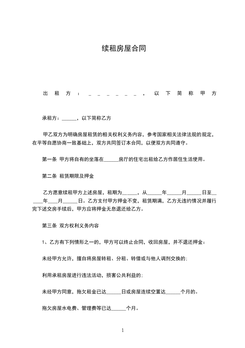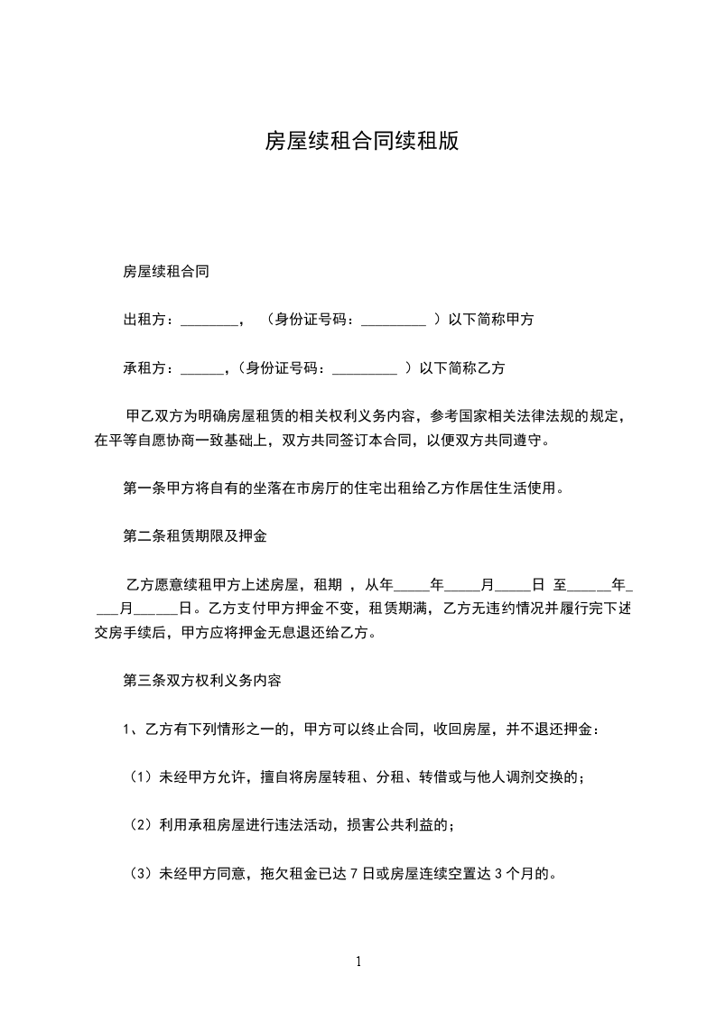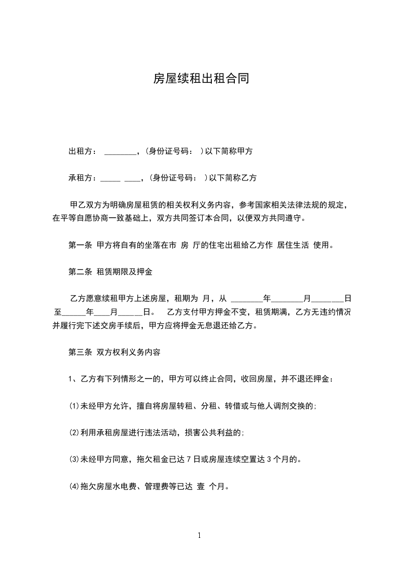 乙方愿意续租甲方上述房屋,租期为______,从______年______月______日至______年____月______日。乙方支付甲方押金不变,租赁期满,乙方无违约情况并履行完下述交房手续后,甲方应将押金无息退还给乙方。