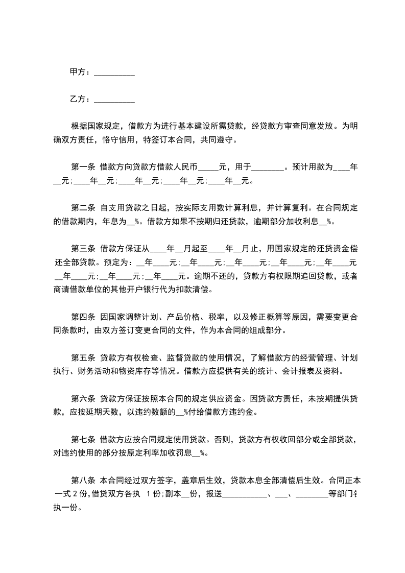 根据国家规定,借款方为进行基本建设所需贷款,经贷款方审查同意发放。为明确双方责任,恪守信用,特签订本合同,共同遵守。