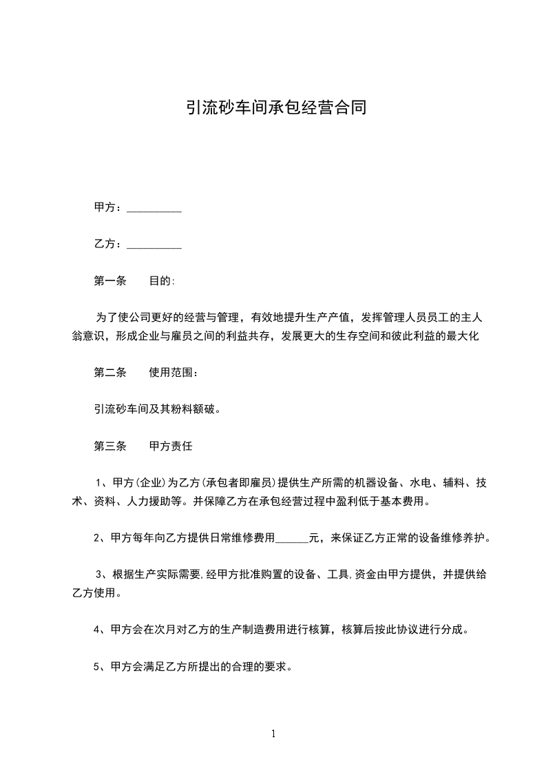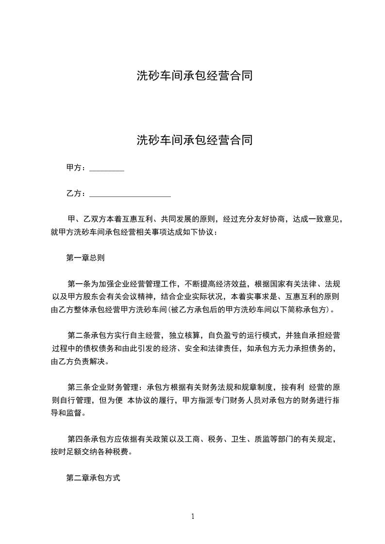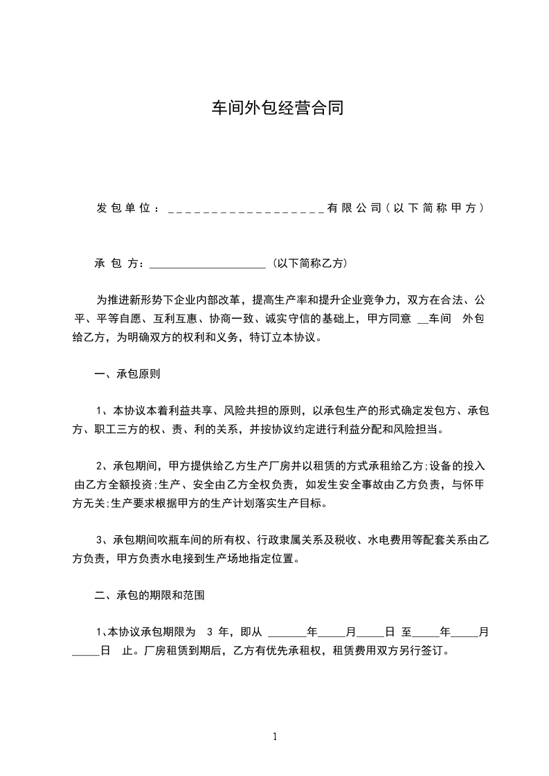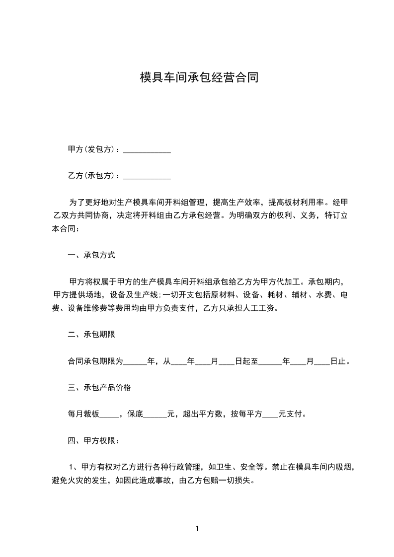 1、乙方承包车间位置,自东往西,标号为3至6号共________间,每间每月_______元,四间合计月承包金为___________元整。