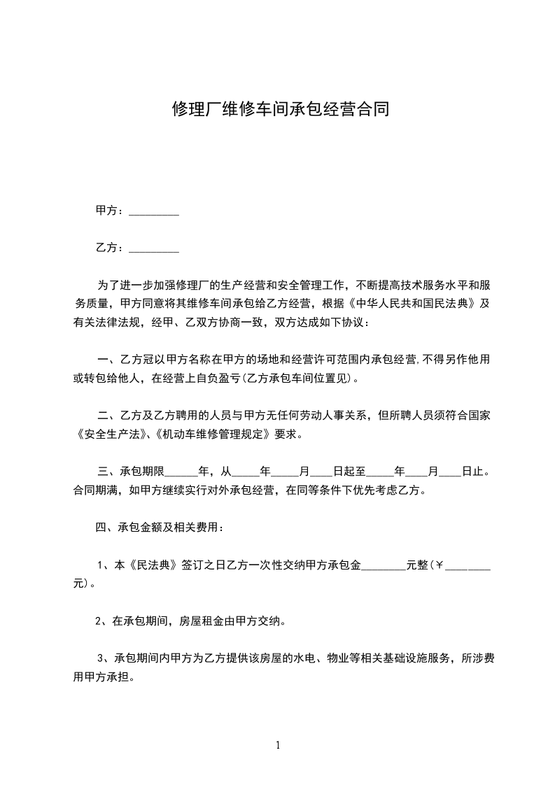 为了进一步加强修理厂的生产经营和安全管理工作,不断提高技术服务水平和服务质量,甲方同意将其部分维修车间承包给乙方经营,根据国家《安全生产法》、《机动车维修管理规定》、《汽车维护、检测、诊断技术规范》,经甲、乙双方协商一致,双方达成如下协议: