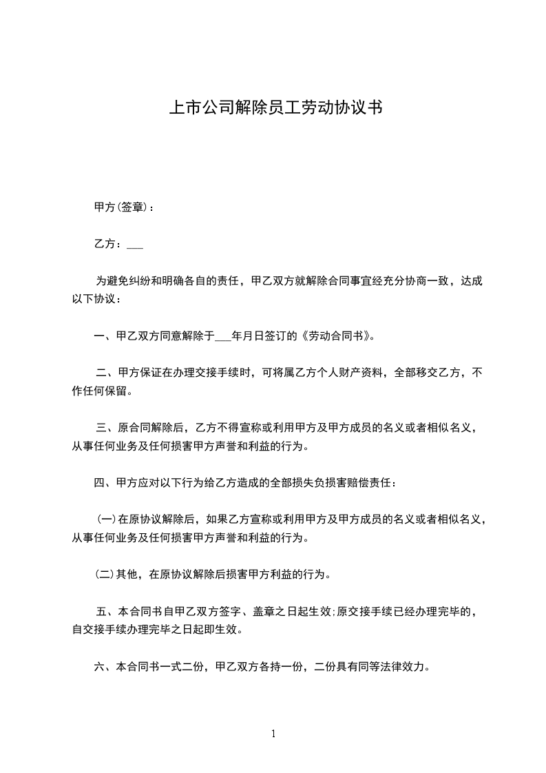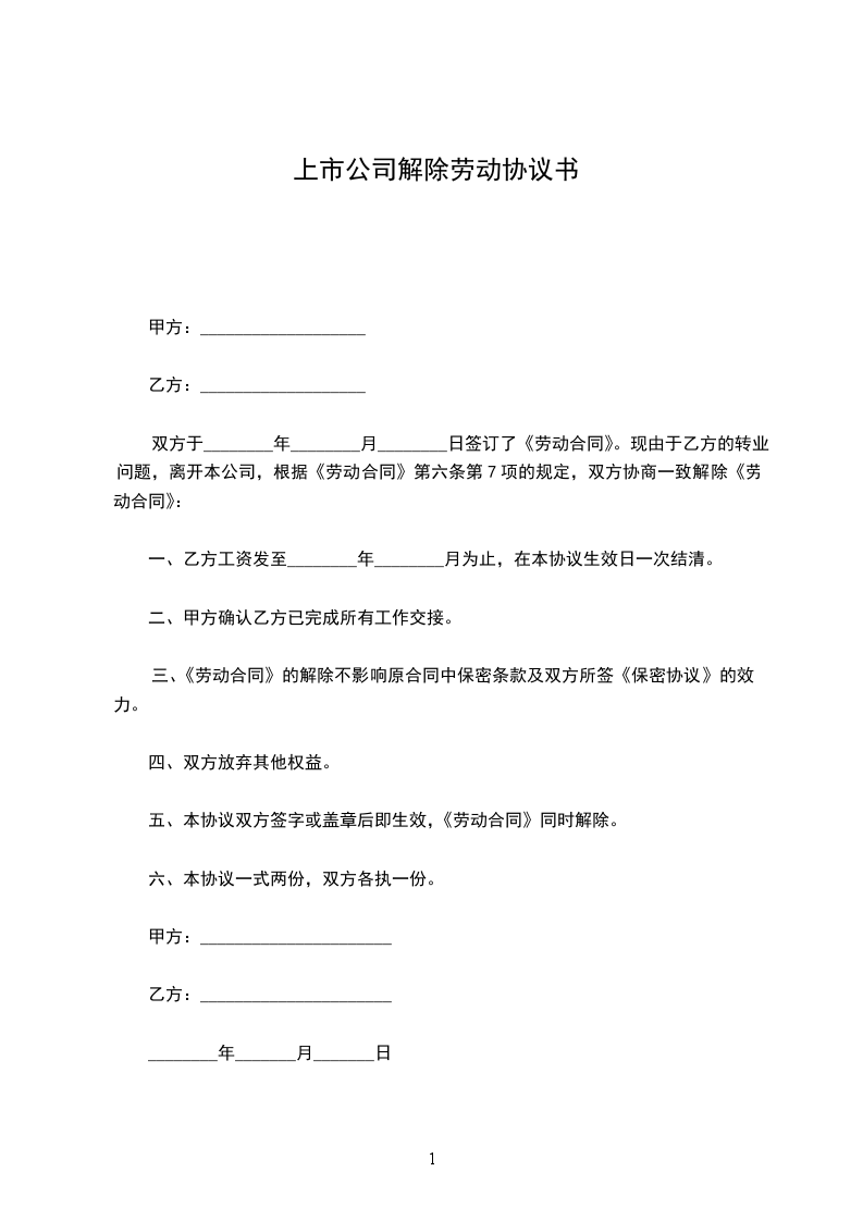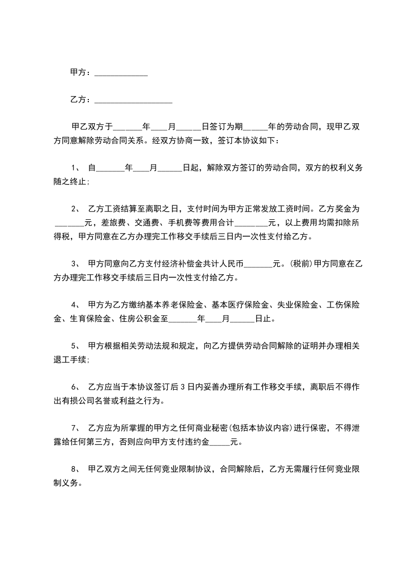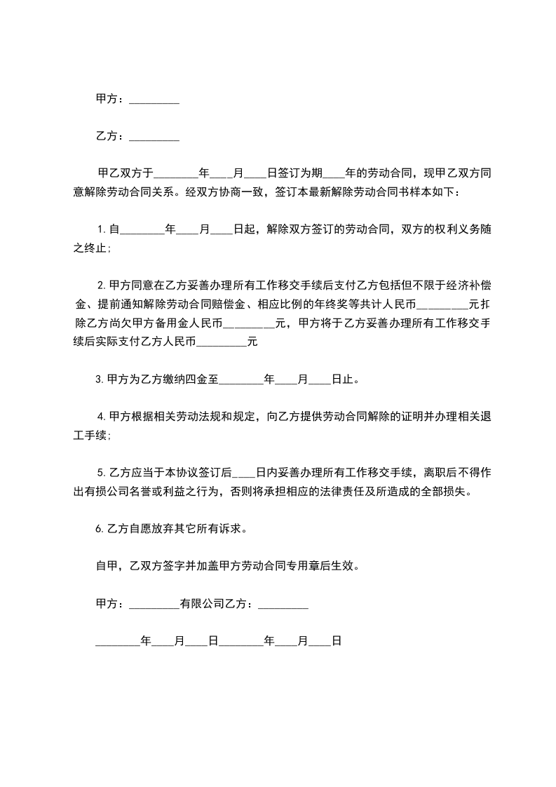 1.自________年____月____日起,解除双方签订的劳动合同,双方的权利义务随之终止;