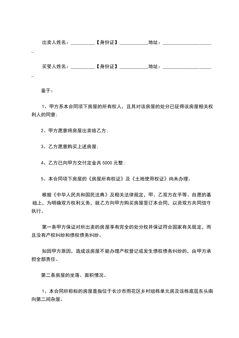 1、本合同所称标的房屋是指位于长沙市雨花区乡村组栋单元房及该栋底层东头南向第二间杂屋。