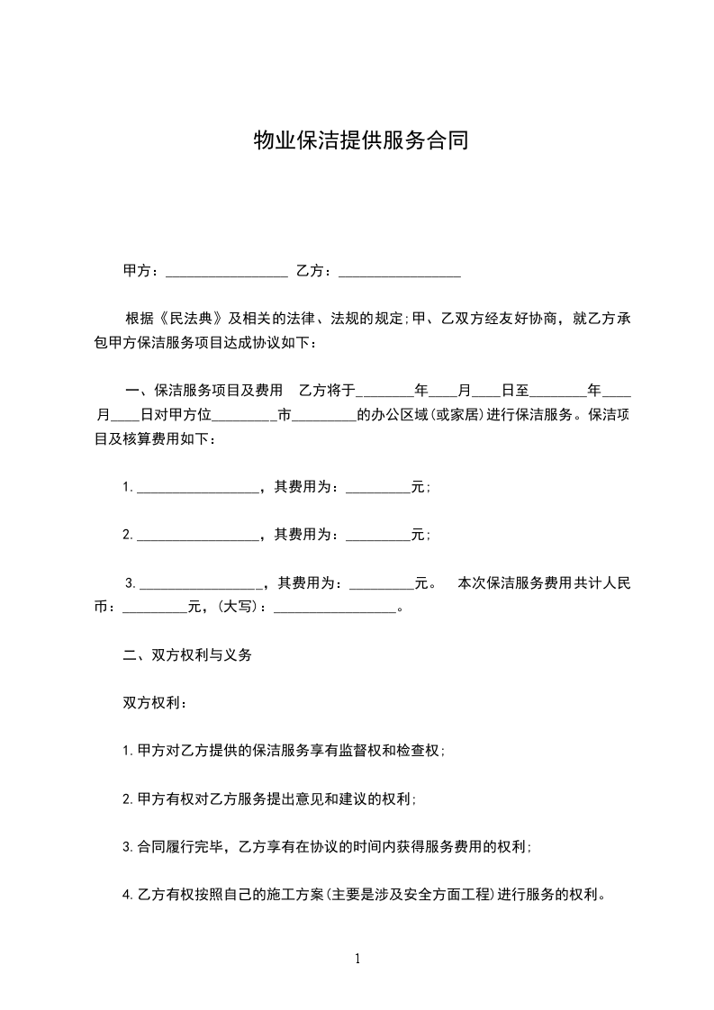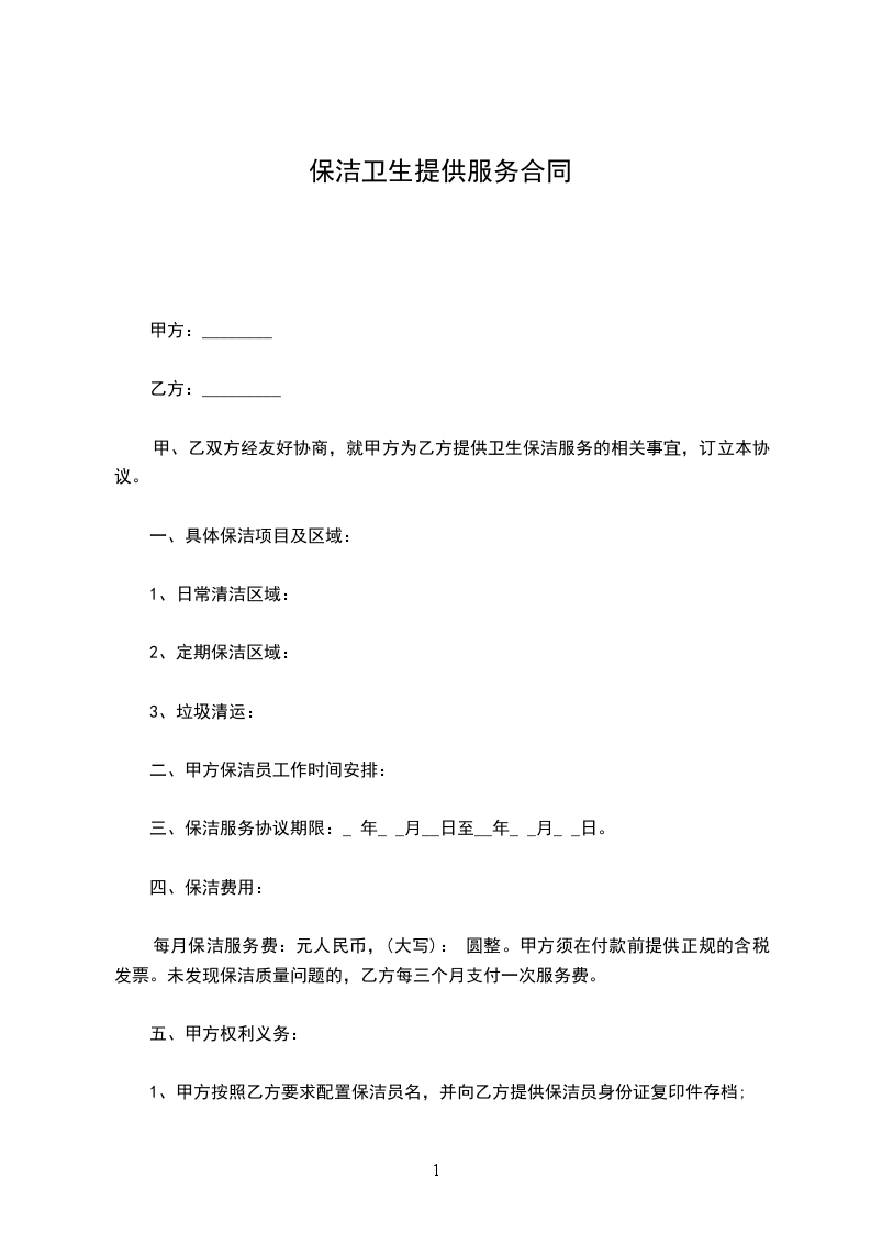 ⒃乙方保洁工作中所需器械、洁具、清洁剂、劳保用品等,由乙方承担。⒄本合同终止前一个月,如乙方决定续约,须向甲方提供书面续约申请,甲方同意续约的'应在合同期满前10日内给予答复,双方重新签订合同。