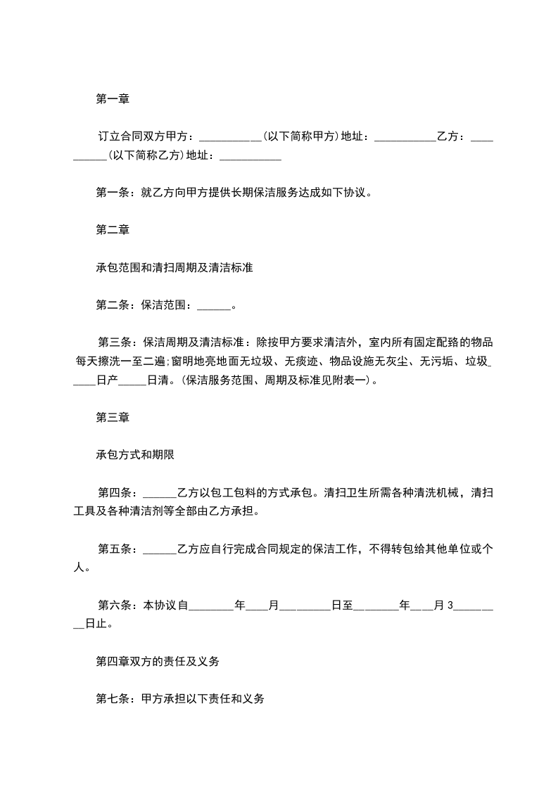 三、保洁期限:_____年,自_____年_____月_____日至_____年_____月_____日,其中前三个月为试用期。