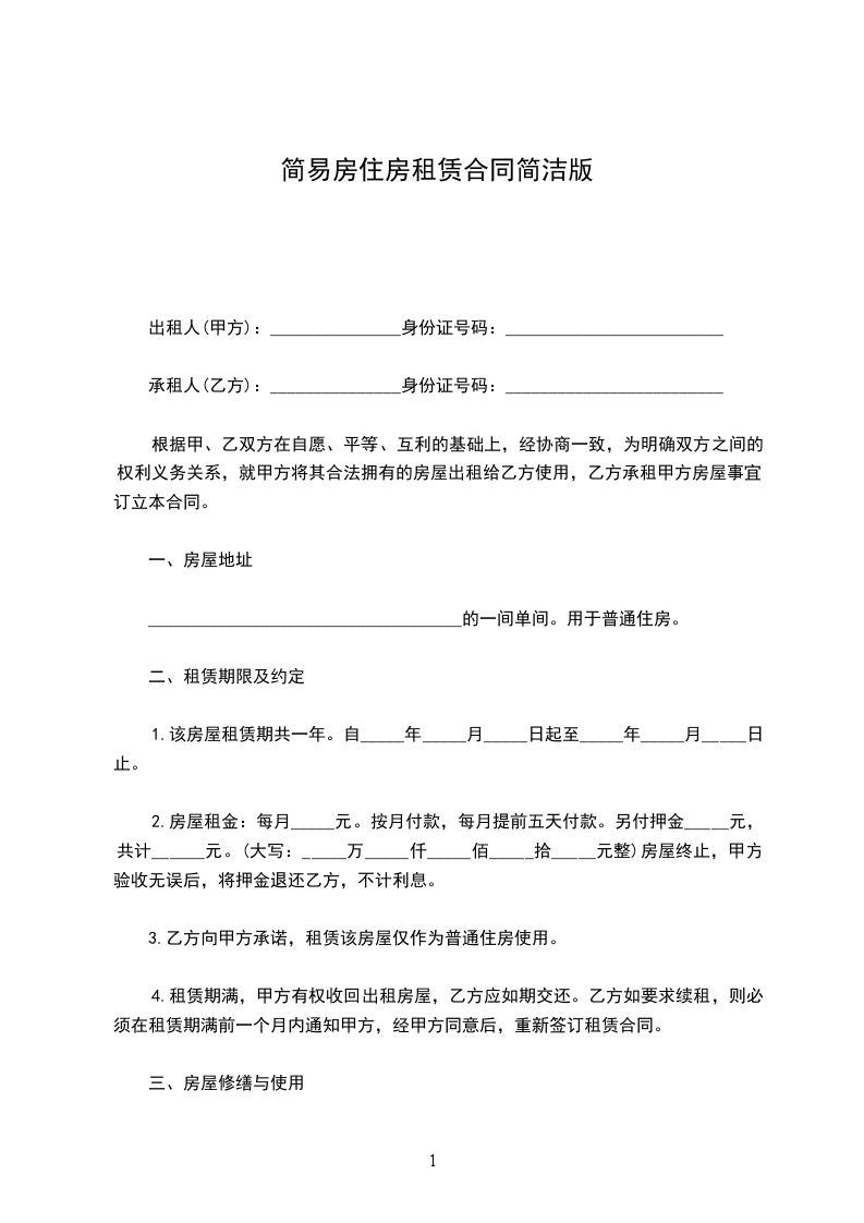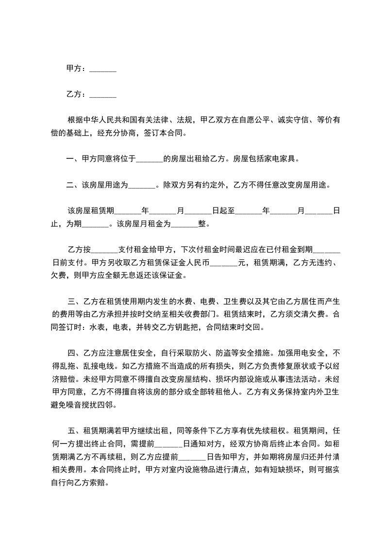 五、租赁期满若甲方继续出租,同等条件下乙方享有优先续租权。租赁期间,任何一方提出终止合同,需提前_______日通知对方,经双方协商后终止本合同。如租赁期满乙方不再续租,则乙方应提前_______日告知甲方,并如期将房屋归还并付清相关费用。本合同终止时,甲方对室内设施物品进行清点,如有短缺损坏,则可据实自行向乙方索赔。