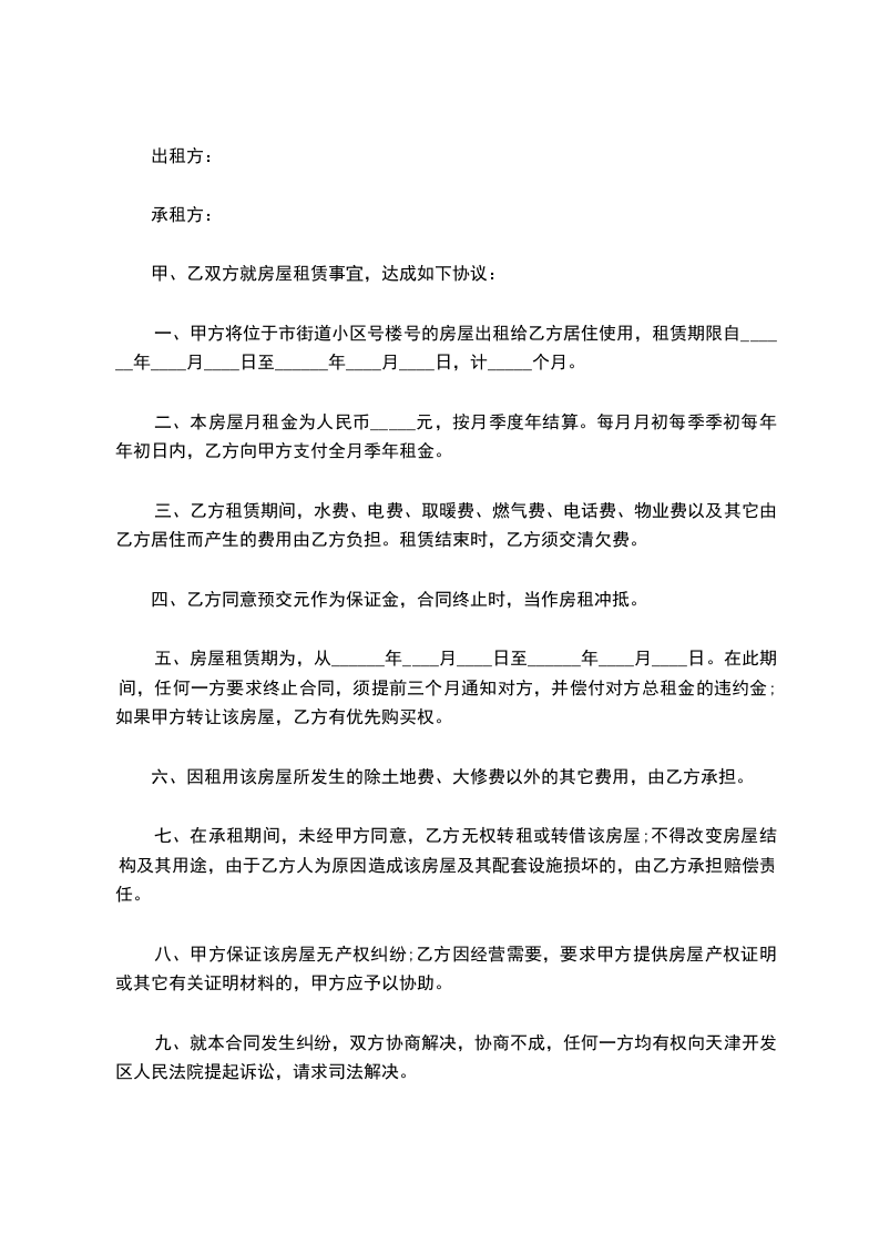 第九条 在租住期间,双方应本着“节约、爱惜”的原则,不得浪费水、电、煤气等。应共同维护设施的安全。