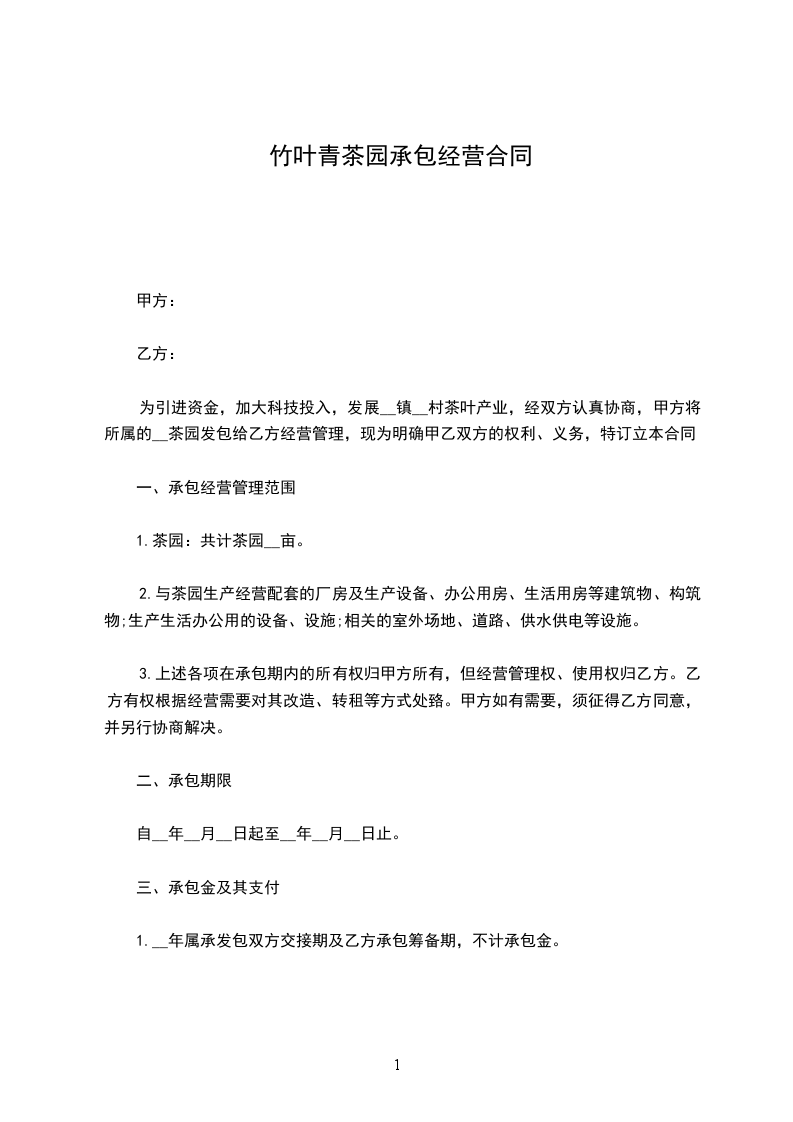 为引进资金,加大科技投入,发展__镇__村茶叶产业,经双方认真协商,甲方将所属的__茶园发包给乙方经营管理,现为明确甲乙双方的权利、义务,特订立本合同。