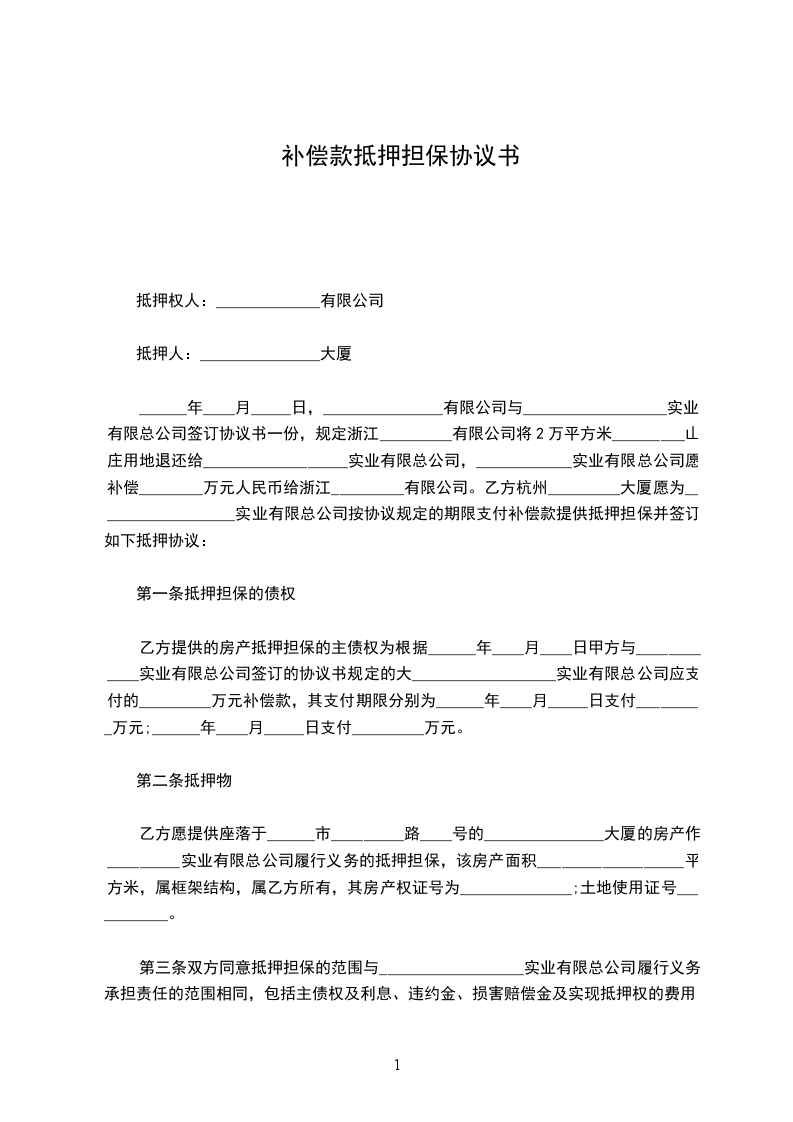 ______年____月_____日,_______________有限公司与__________________实业有限总公司签订协议书一份,规定浙江_________有限公司将2万平方米_________山庄用地退还给__________________实业有限总公司,____________实业有限总公司愿补偿________万元人民币给浙江_________有限公司。乙方杭州_________大厦愿为__________________实业有限总公司按协议规定的期限支付补偿款提供抵押担保并签订如下抵押协议: