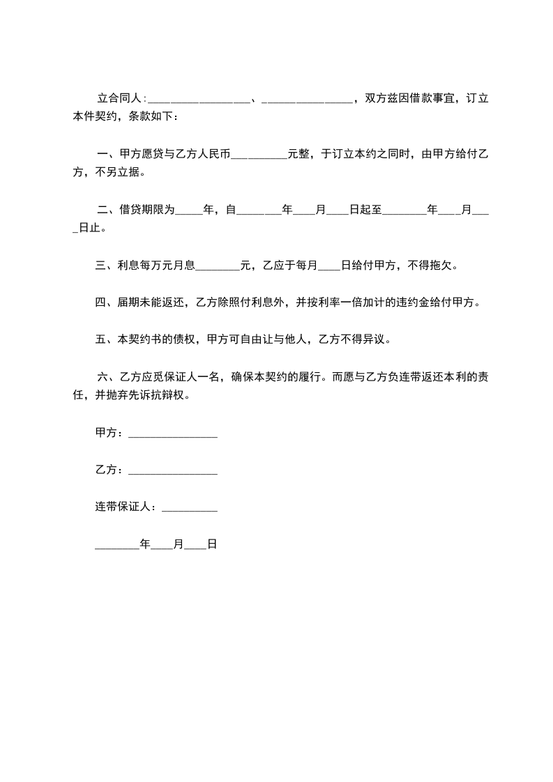 一、甲方愿贷与乙方人民币__________元整,于订立本约之同时,由甲方给付乙方,不另立据。