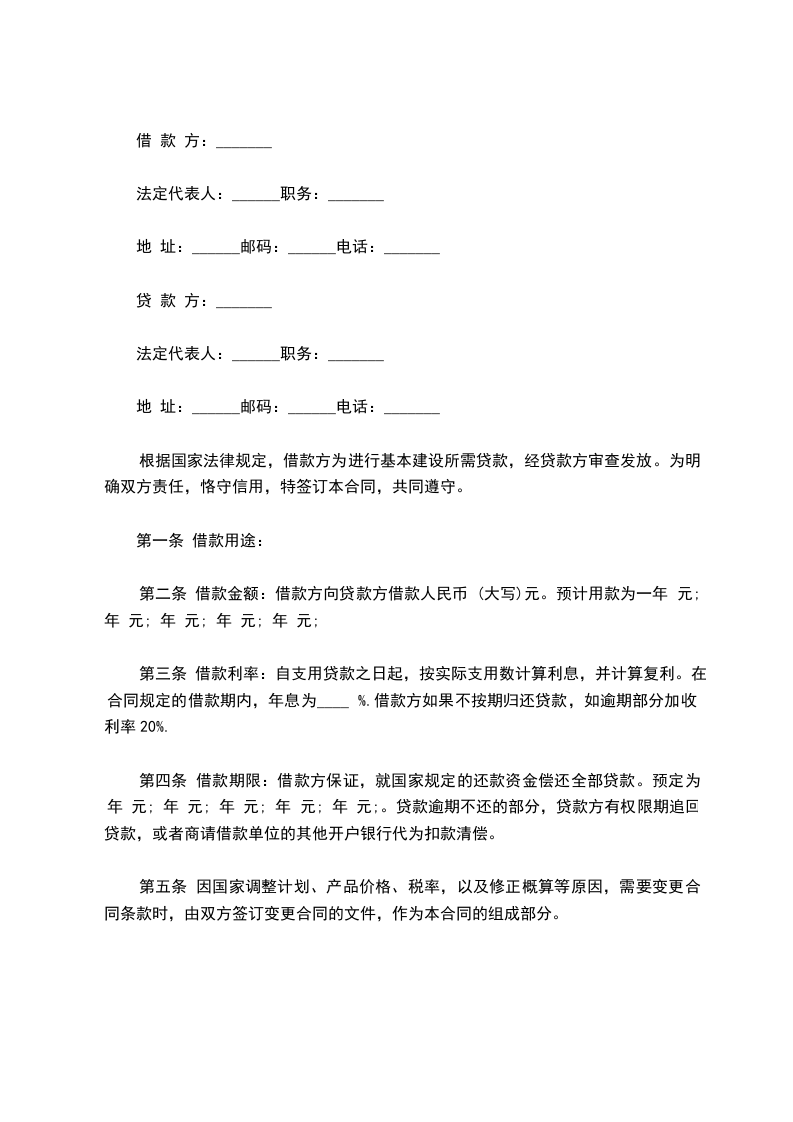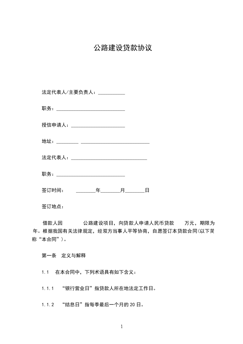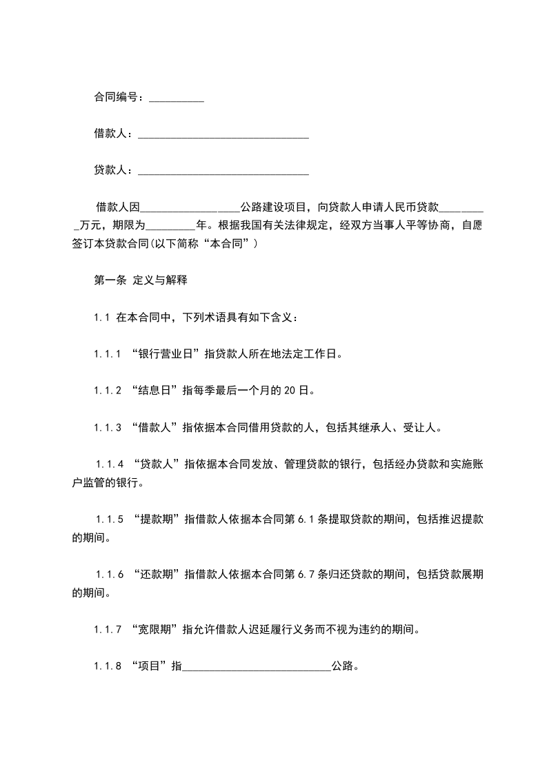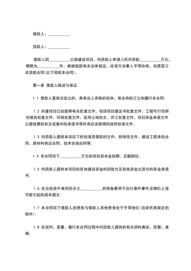 借款人因___________公路建设项目,向贷款人申请人民币贷款___________万元,期限为___________年。根据我国有关法律规定,经双方当事人平等协商,自愿签订本贷款合同。