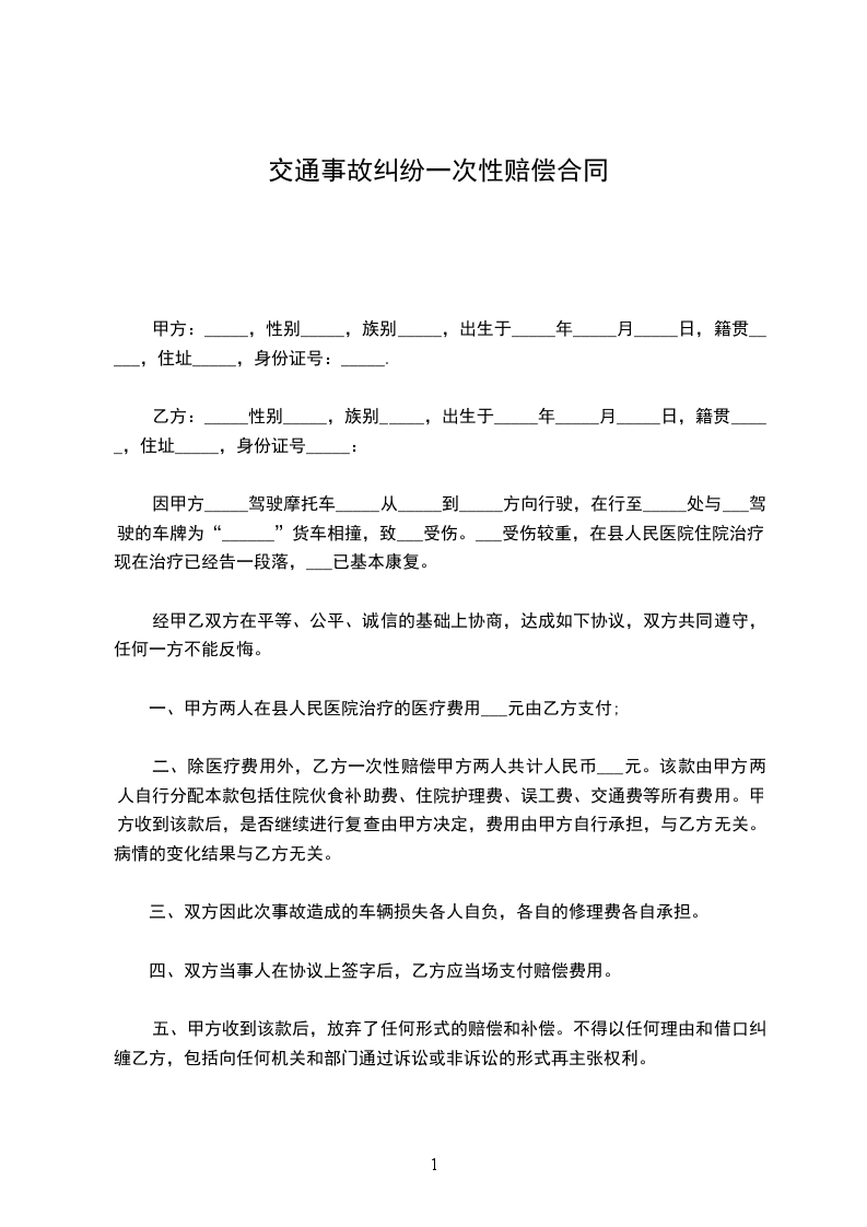二、除医疗费用外,乙方一次性赔偿甲方两人共计人民币___元。该款由甲方两人自行分配本款包括住院伙食补助费、住院护理费、误工费、交通费等所有费用。甲方收到该款后,是否继续进行复查由甲方决定,费用由甲方自行承担,与乙方无关。病情的变化结果与乙方无关。