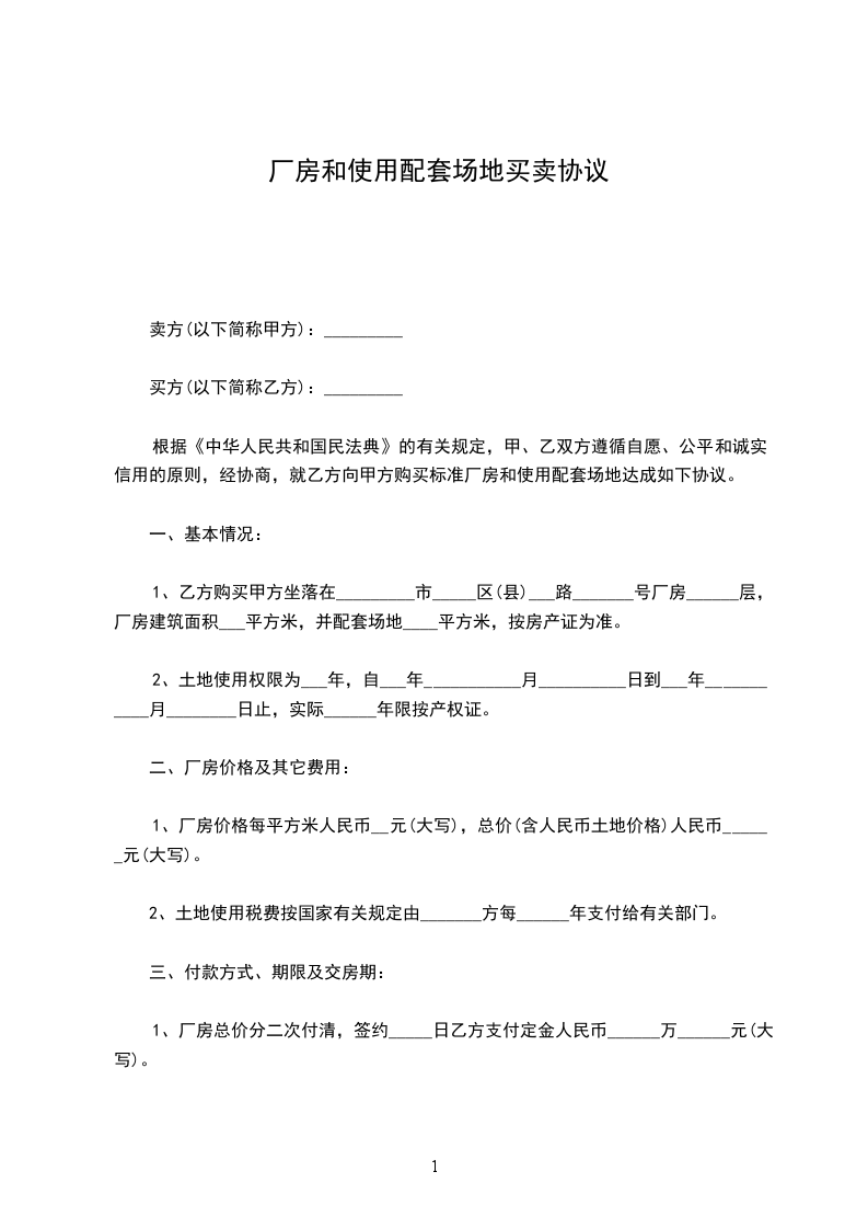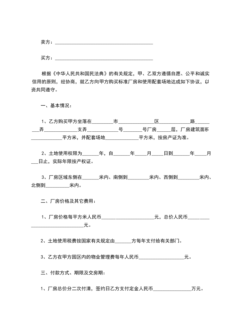 根据《中华人民共和国民法典》的有关规定,甲、乙双方遵循自愿、公平和诚实信用的原则,经协商,就乙方向甲方购买标准厂房和使用配套场地达成如下协议。
