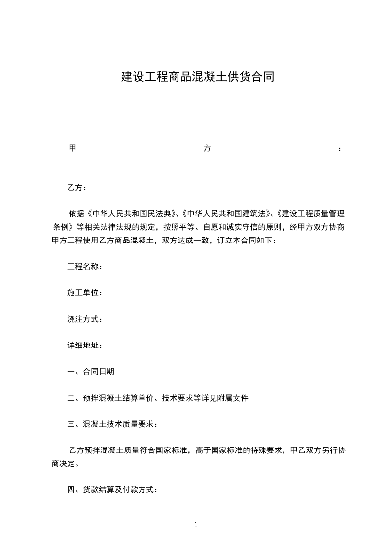 依据《中华人民共和国民法典》、《中华人民共和国建筑法》、《建设工程质量管理条例》等相关法律法规的规定,按照平等、自愿和诚实守信的原则,经甲方双方协商,甲方工程使用乙方商品混凝土,双方达成一致,订立本合同如下:
