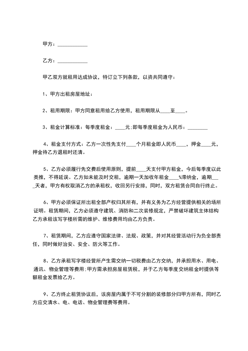 2、若承租方在出租方没有违反本合同的情况下提前解除合同,视为承租方违约,承租方负责赔偿违约金_________元。