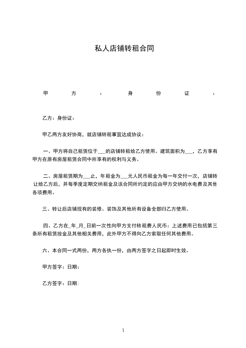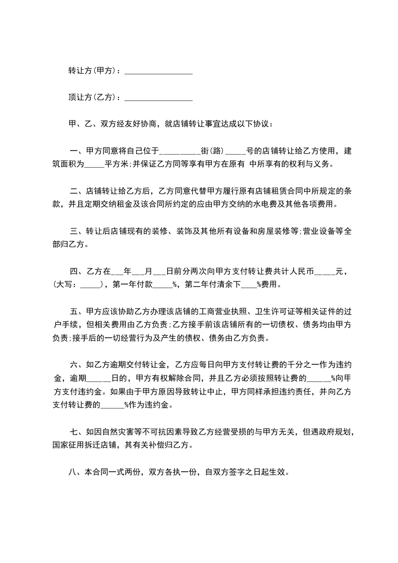 甲乙两方友好协商,就店铺转租事宜达成协议: