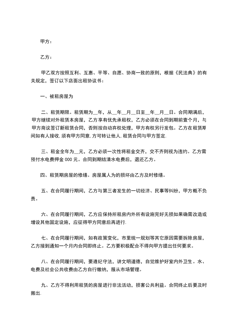 甲乙双方按照互利、互惠、平等、自愿、协商一致的原则,根据《民法典》的有关规定,签订以下店面出租协议书: