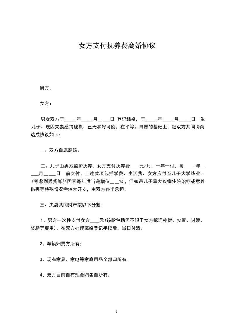 二、女儿__由女方抚养,另男方每个月支付600元的抚养费。