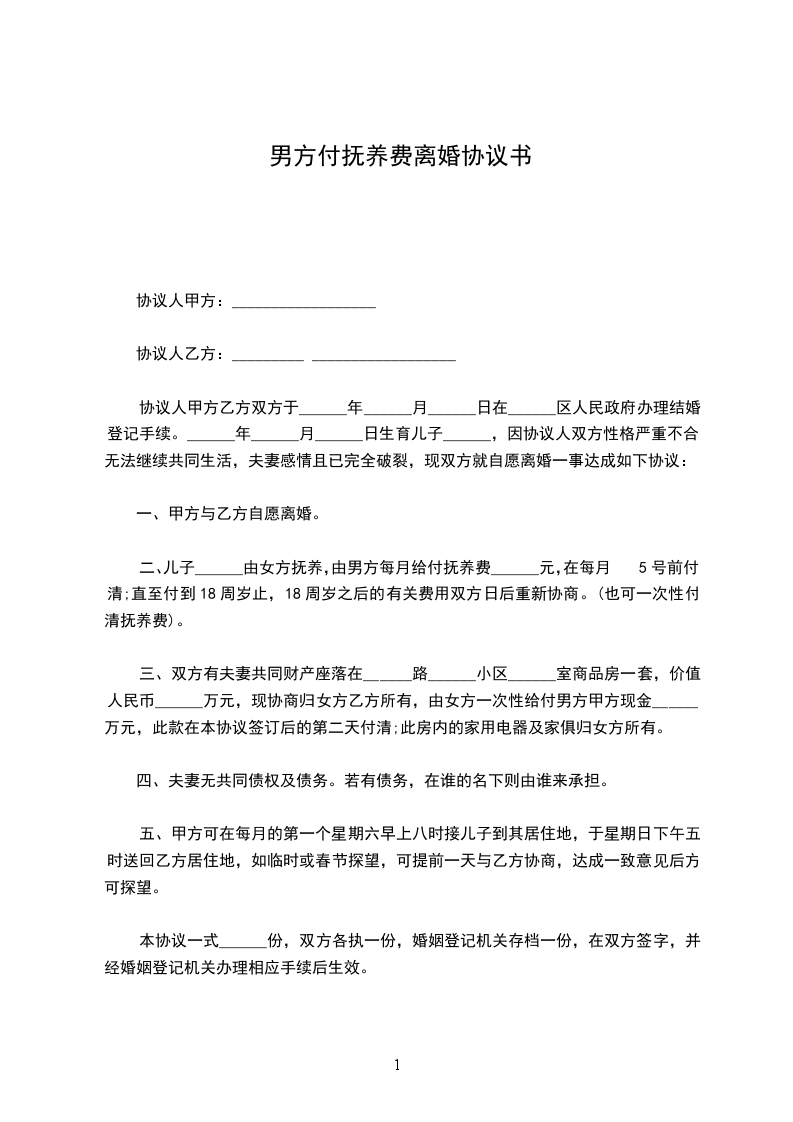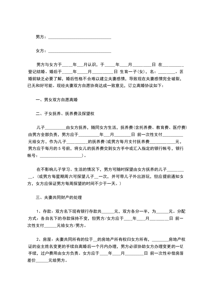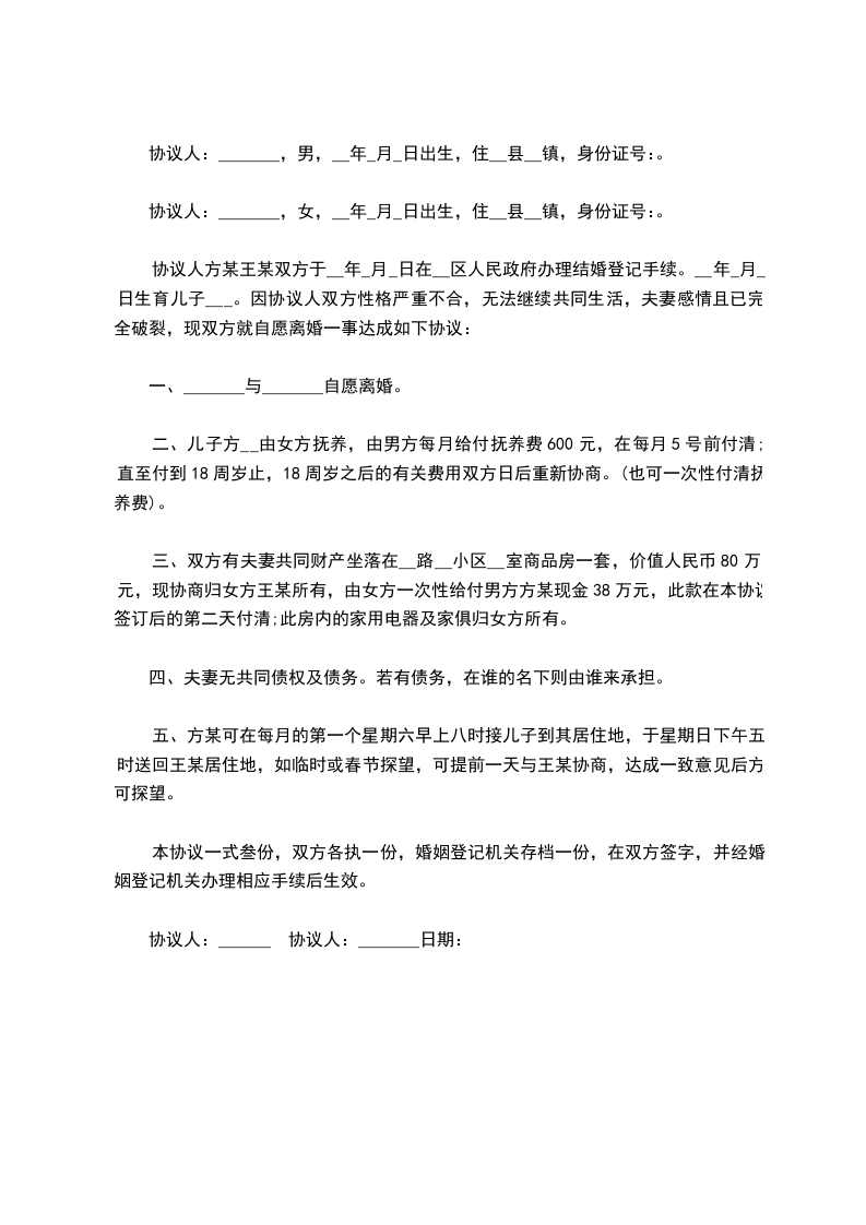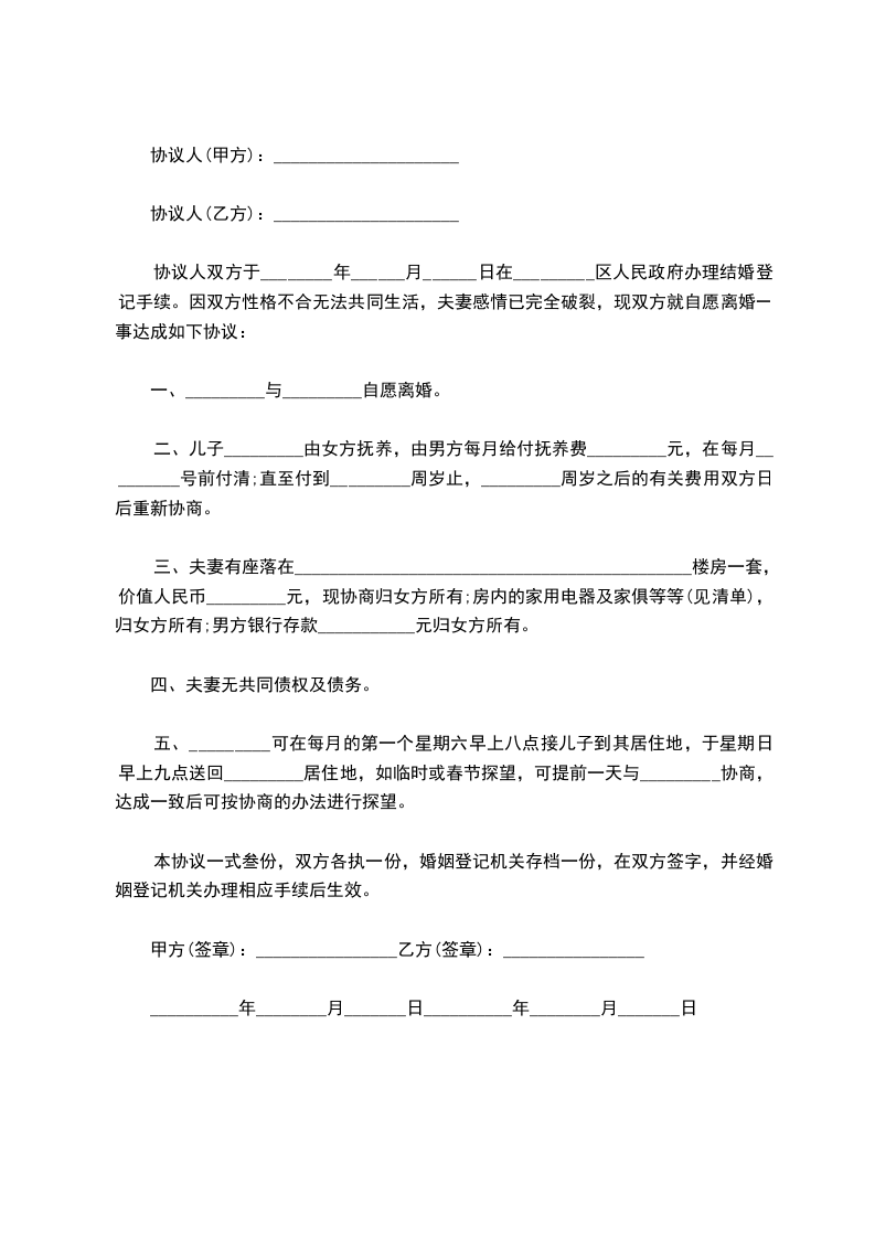 七、本离婚协议一式叁份,双方各执一份,婚姻登记机关存档一份,在双方签字,并经婚姻登记机关办理相应手续后生效。