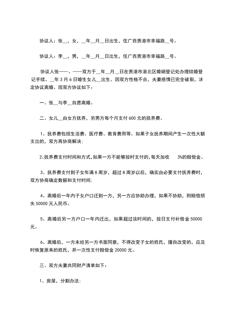 协议人张——、——双方于__年__月__日在贵港市港北区婚姻登记处办理结婚登记手续。__年3月6日婚生女儿__出生。因双方性格不合,夫妻感情已完全破裂,决定协议离婚。现双方协议如下: