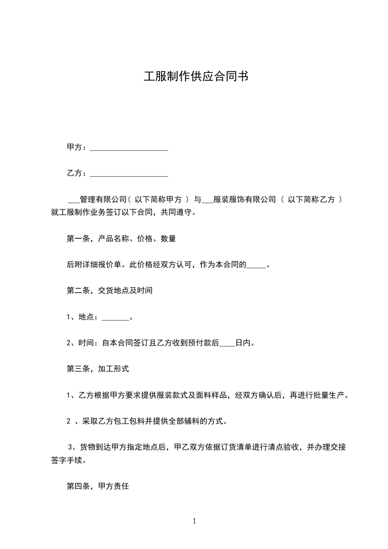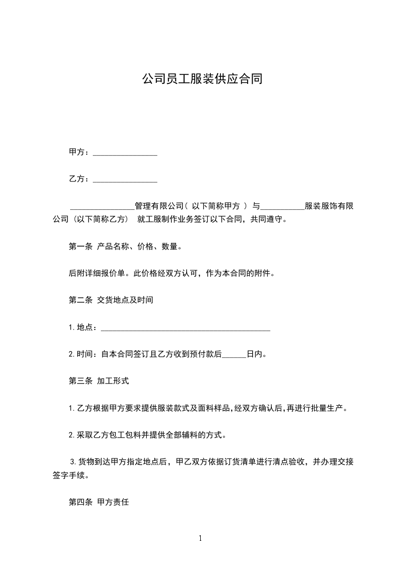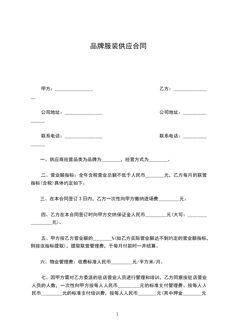 1. 合作模式:乙方确定甲方提供货品的款式,甲方按乙方要求的款式、数量以铺货的方式供货给乙方,乙方保证本年度的进货额达到_____万,向甲方提供保证金____万。甲方保证乙方可以自由的退换货,但总的退换货额度不超过本年度进货额的____%。乙方自行承担经营商铺的租金与人员开支及相关的任何营运费用。