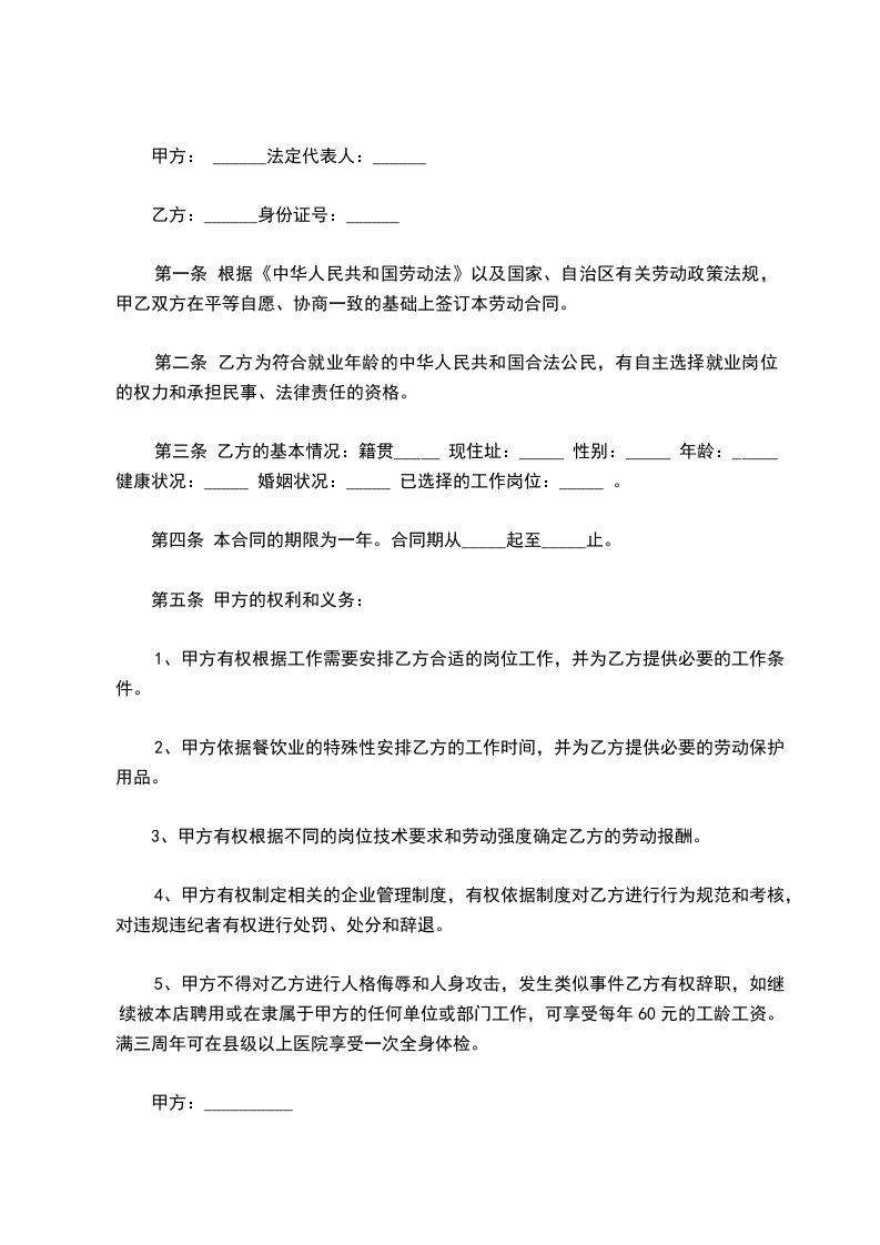 2、甲方依据餐饮业的特殊性安排乙方的工作时间,并为乙方提供必要的劳动保护用品。