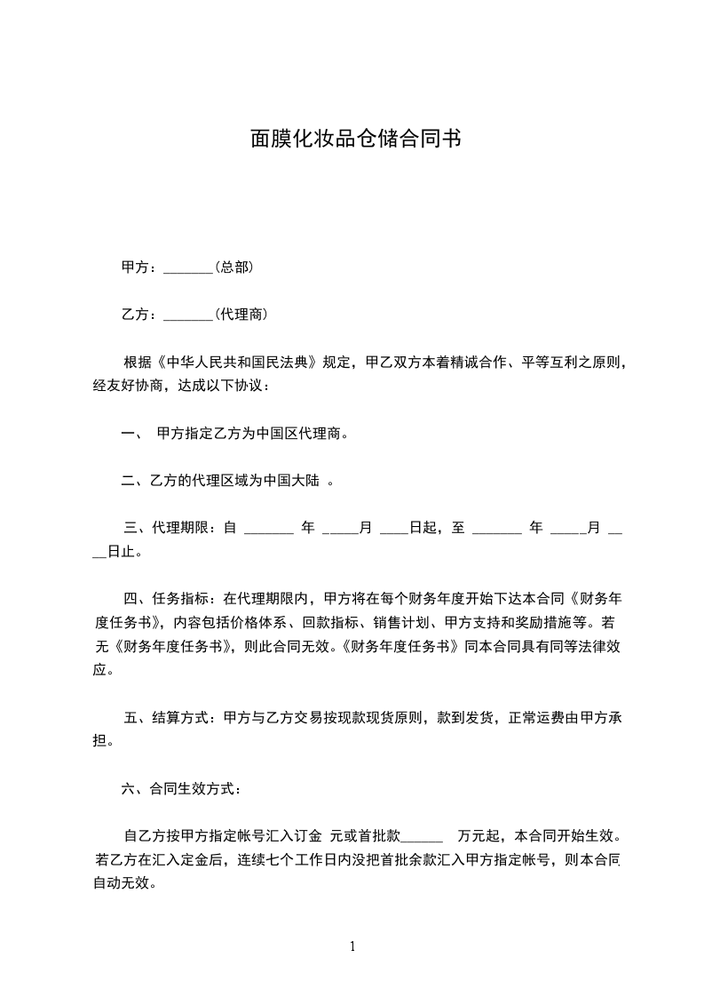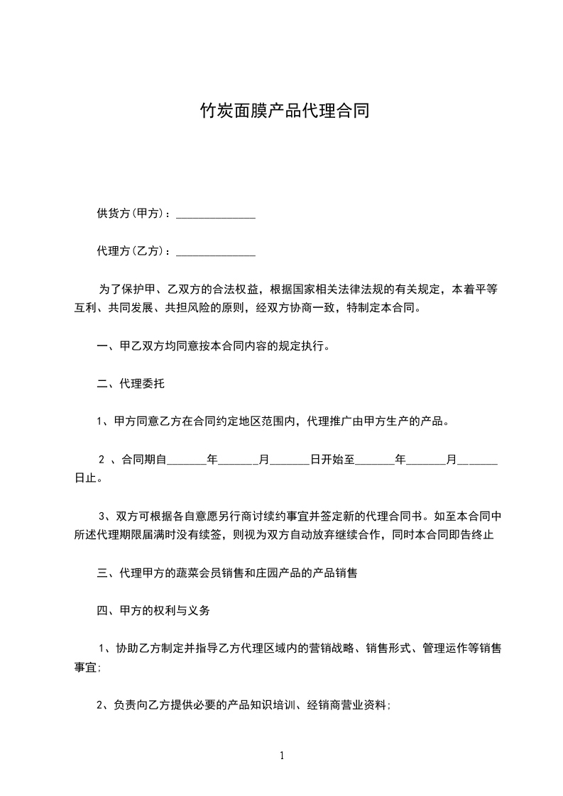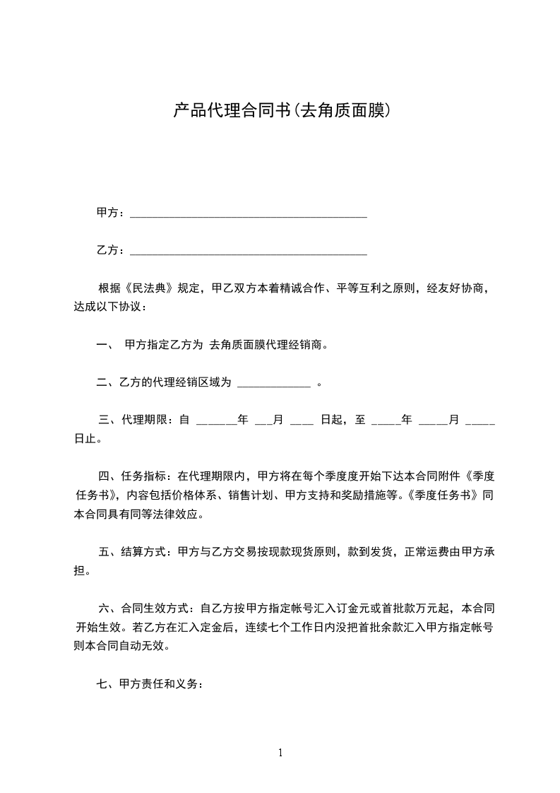 一、 甲方指定乙方为 去角质面膜代理经销商。
