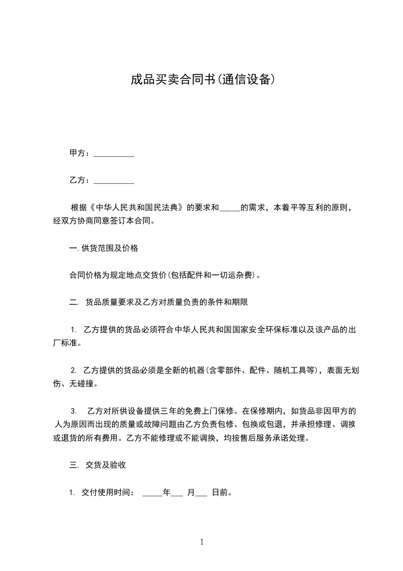 1. 交付使用时间: _____年___ 月___ 日前。