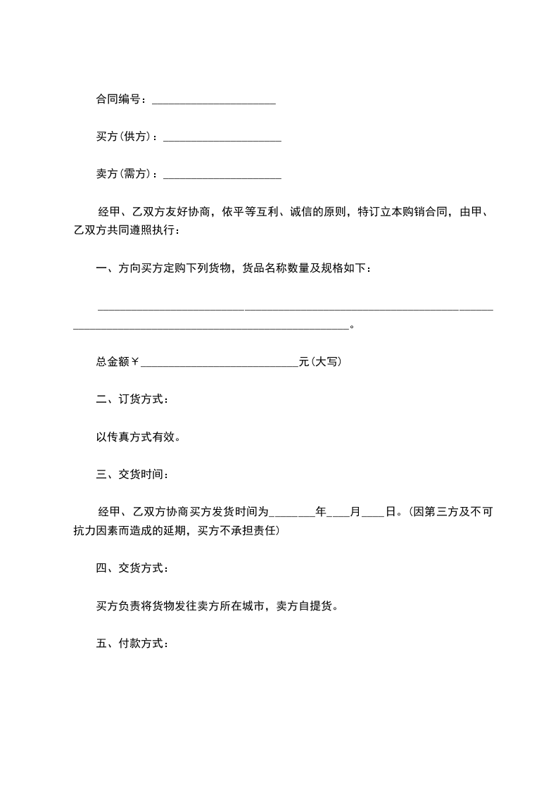 1. 甲方无正当理由拒收货物,甲方向乙方偿付货款总值的5%的违约金。