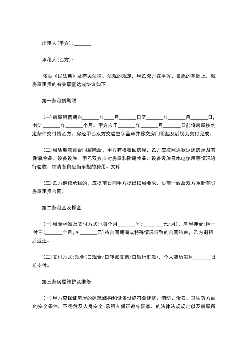 根据《中华人民共和国民法典》及相关法律的规定,甲、乙双方在平等、自愿的基础上,就下列房屋的租赁事宜,达成如下协议: