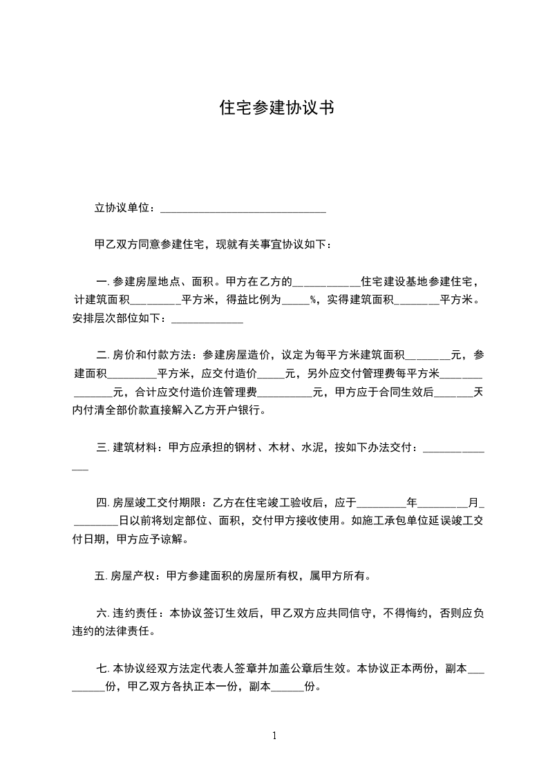 一.参建房屋地点、面积。甲方在乙方的____________住宅建设基地参建住宅,计建筑面积_________平方米,得益比例为_____%,实得建筑面积________平方米。安排层次部位如下:_____________