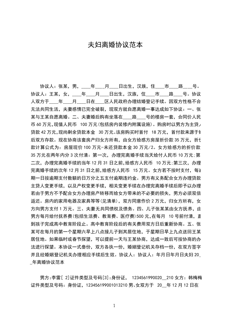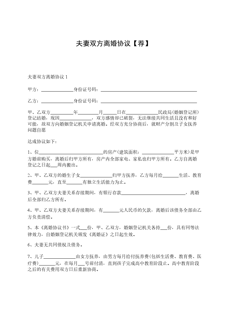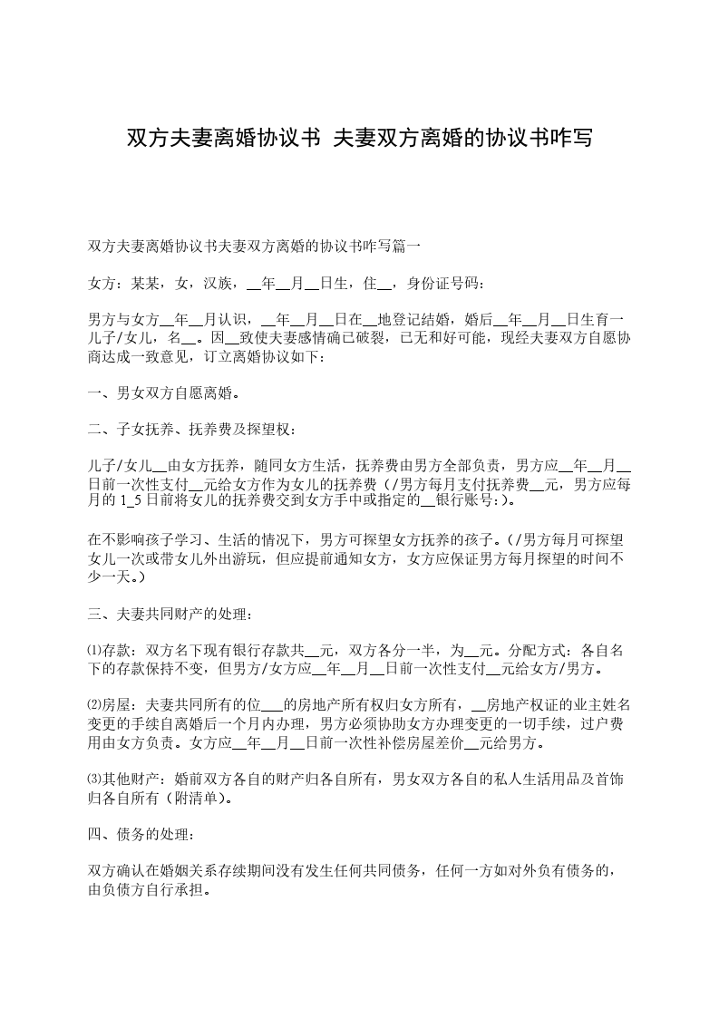 男方__与女方__于____年__月认识,于__年__月__日在____登记结婚,婚后于__年__月__日生育一儿子女儿,名______。因____致使夫妻感情破裂,已无和好可能,现经夫妻双方自愿协商达成一致意见,订立离婚协议如下:
