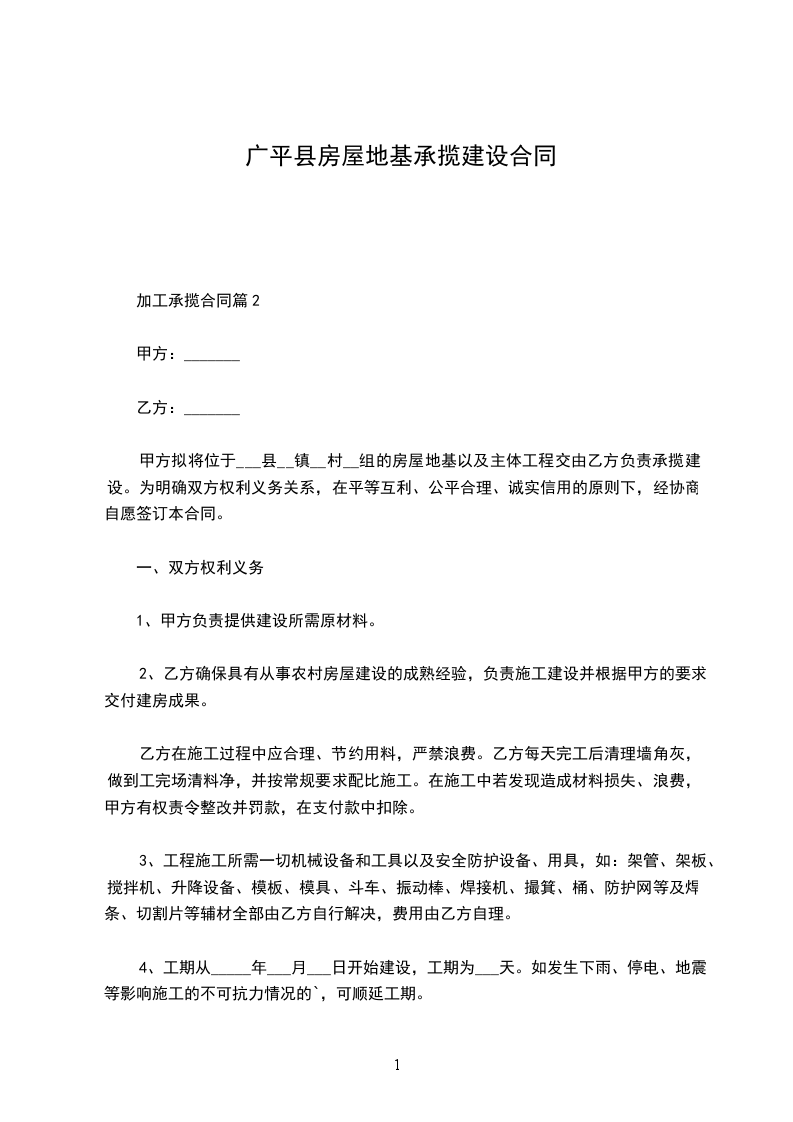 甲方拟将位于___县__镇__村__组的房屋地基以及主体工程交由乙方负责承揽建设。为明确双方权利义务关系,在平等互利、公平合理、诚实信用的原则下,经协商自愿签订本合同。