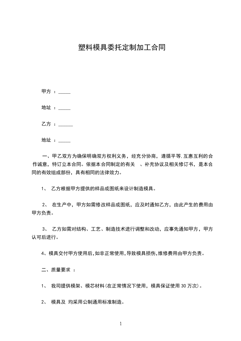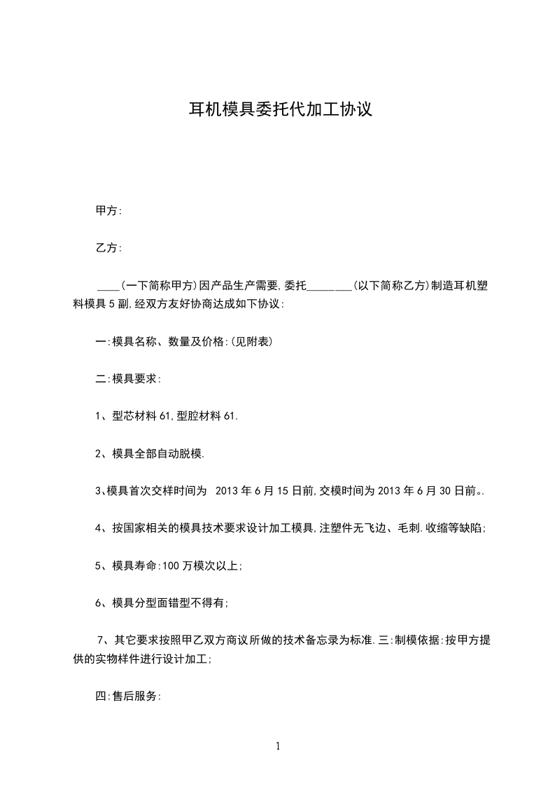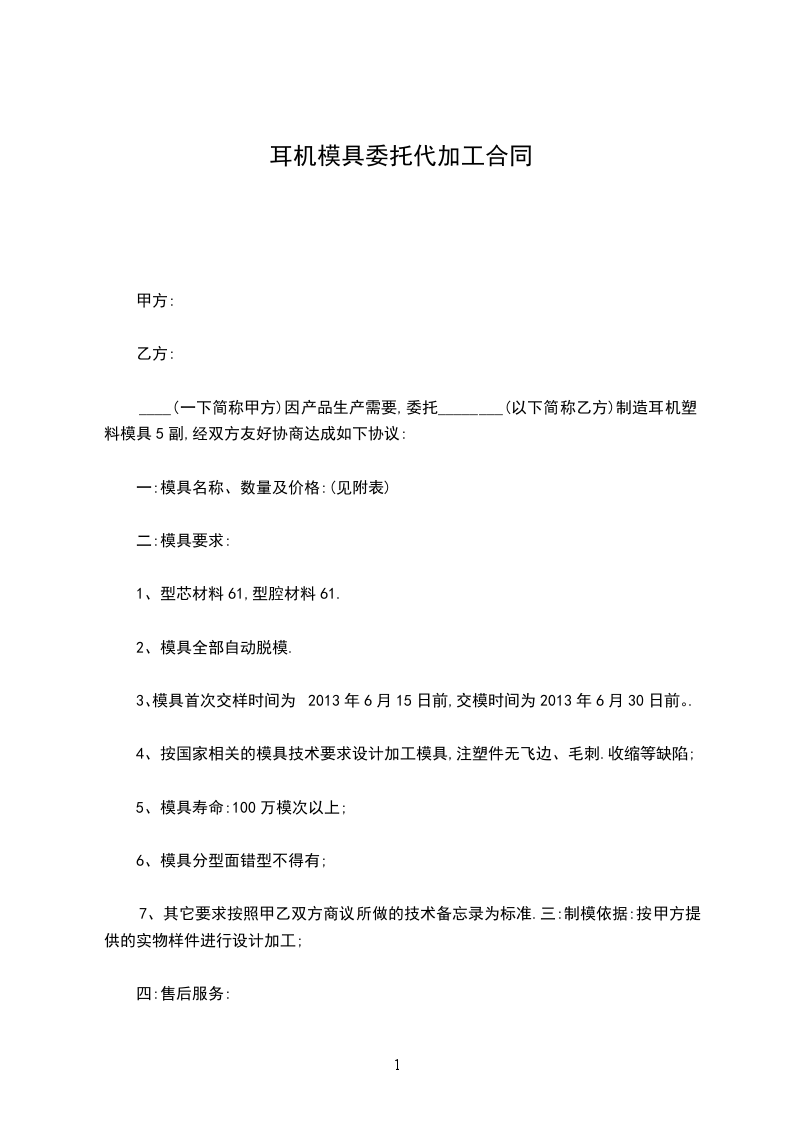 第五条:本合同模具总金额为万元。共套模具。货款结算时间及方法:。付款方式:签订合同预付%,试模合格交付使用个月内付%