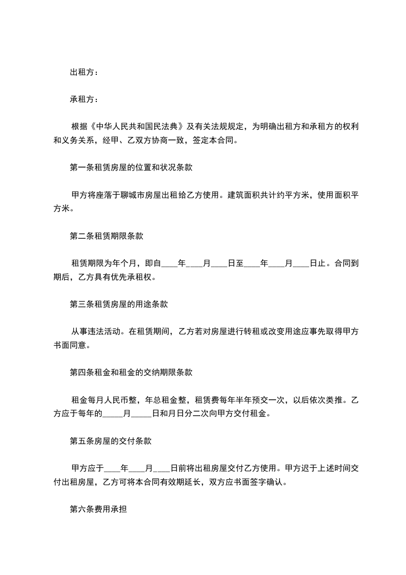 甲方将座落于聊城市房屋出租给乙方使用。建筑面积共计约平方米,使用面积平方米。