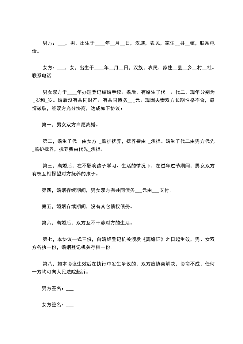 男女双方于____年办理登记结婚手续。婚后,有婚生子代一、代二,现年分别为_岁和_岁。婚后没有共同财产。有共同债务___元。现因夫妻双方长期性格不合,感情破裂,经双方充分协商,达成如下协议: